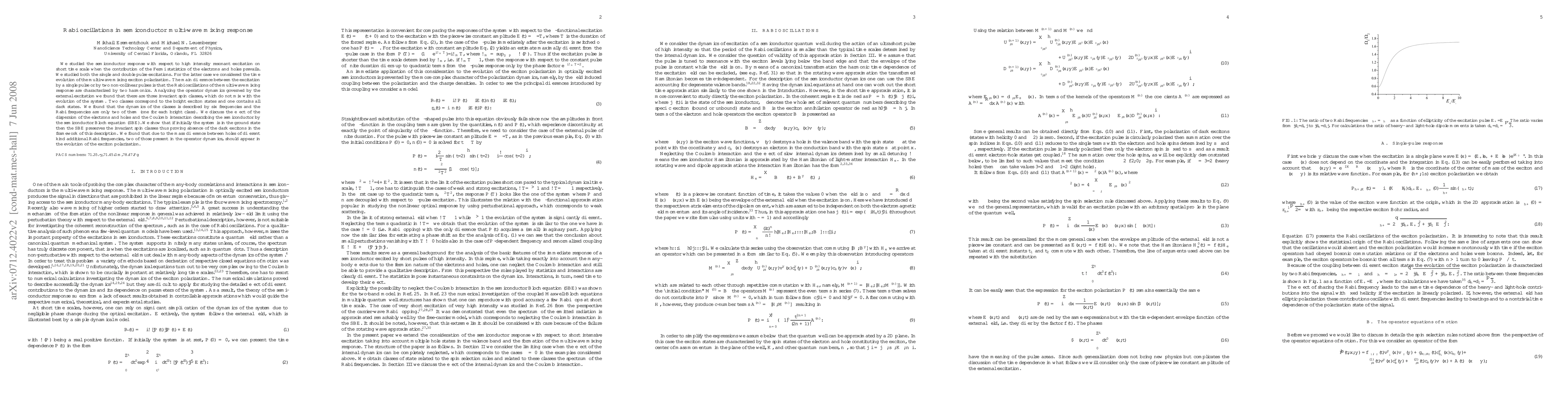 We studied the semiconductor response with respect to high intensity resonant excitation on short time scale when the contribution of the Fermi statistics of the electrons and holes prevails. We studied both the single and double pulse excitations. For the latter case we considered the time evolution of the multi-wave mixing exciton polarization. The main difference between the excitation by a single pulse or by two non-collinear pulses is that the Rabi oscillations of the multi-wave mixing response are characterized by two harmonics. Analyzing the operator dynamics governed by the external excitation we found that there are three invariant spin classes, which do not mix with the evolution of the system. Two classes correspond to the bright exciton states and one contains all dark states. We found that the dynamics of the classes is described by six frequencies and the Rabi frequencies are only two of them (one for each bright class). We discuss the effect of the dispersion of the electrons and holes and the Coulomb interaction describing the semiconductor by the semiconductor Bloch equation (SBE). We show that if initially the system is in the ground state then the SBE preserves the invariant spin classes thus proving absence of the dark excitons in the framework of this description. We found that due to the mass difference between holes of different kind additional Rabi frequencies, two of those present in the operator dynamics, should appear in the evolution of the exciton polarization.