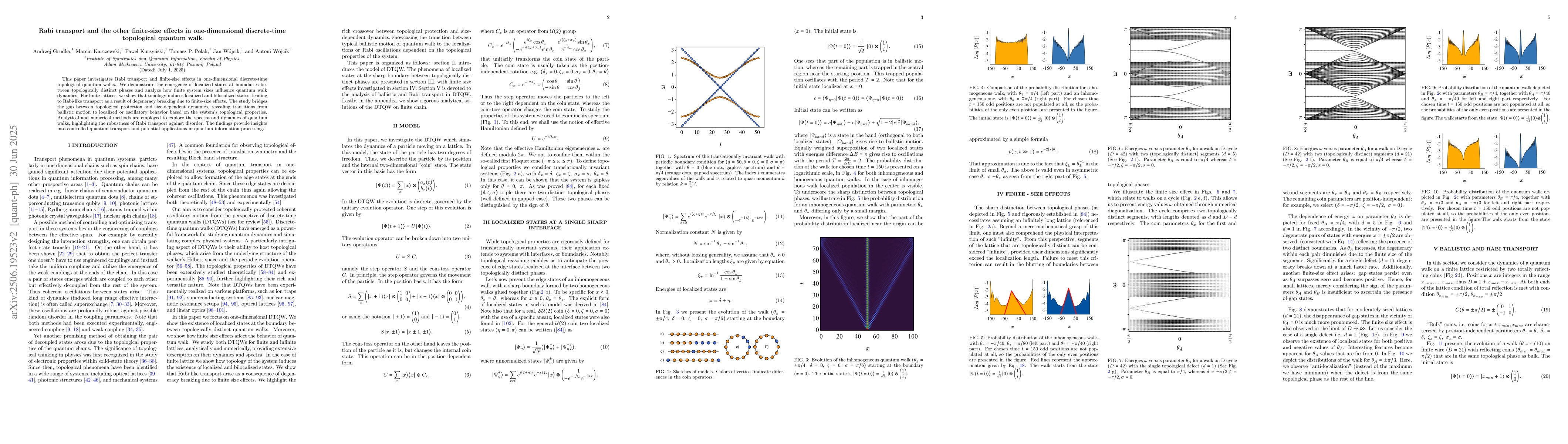 This paper investigates Rabi transport and finite-size effects in one-dimensional discrete-time topological quantum walks. We demonstrate the emergence of localized states at boundaries between topologically distinct phases and analyze how finite system sizes influence quantum walk dynamics. For finite lattices, we show that topology induces localized and bilocalized states, leading to Rabi-like transport as a result of degeneracy breaking due to finite-size effects. The study bridges the gap between topological protection and size-dependent dynamics, revealing transitions from ballistic motion to localized or oscillatory behavior based on the system's topological properties. Analytical and numerical methods are employed to explore the spectra and dynamics of quantum walks, highlighting the robustness of Rabi transport against disorder. The findings provide insights into controlled quantum transport and potential applications in quantum information processing.