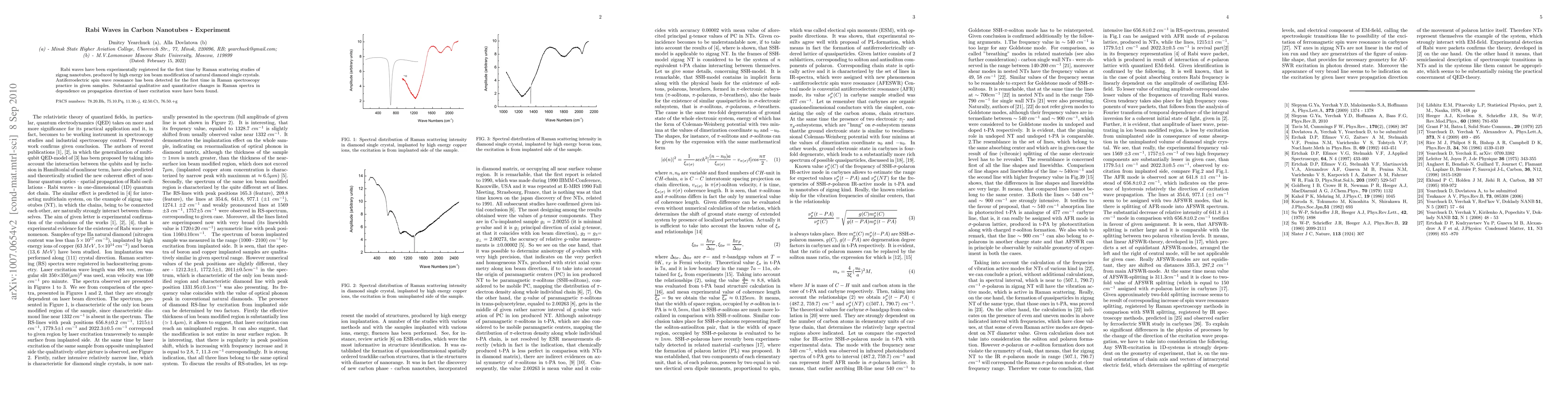 Rabi waves have been experimentally registered for the first time by Raman scattering studies of zigzag nanotubes, produced by high energy ion beam modification of natural diamond single crystals. Antiferroelectric spin wave resonance has been detected for the first time in Raman spectroscopy practice in given samples. Substantial qualitative and quantitative changes in Raman spectra in dependence on propagation direction of laser excitation wave have been found.