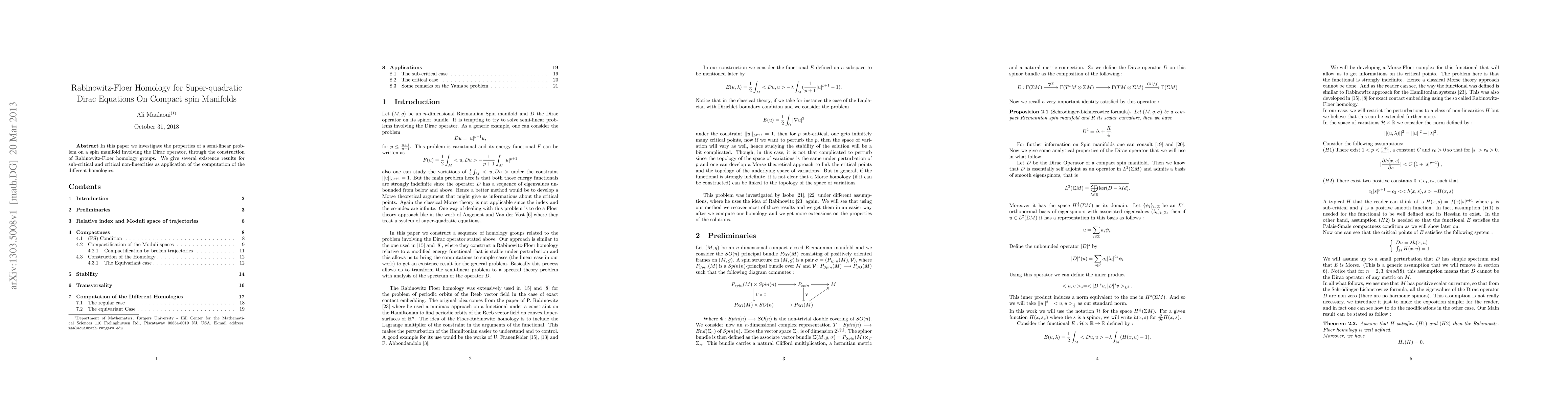This research paper explores properties of a semi-linear problem on spin manifolds using the Dirac operator and Rabinowitz-Floer homology groups. It presents existence results for sub-critical and critical non-linearities through computed homologies.