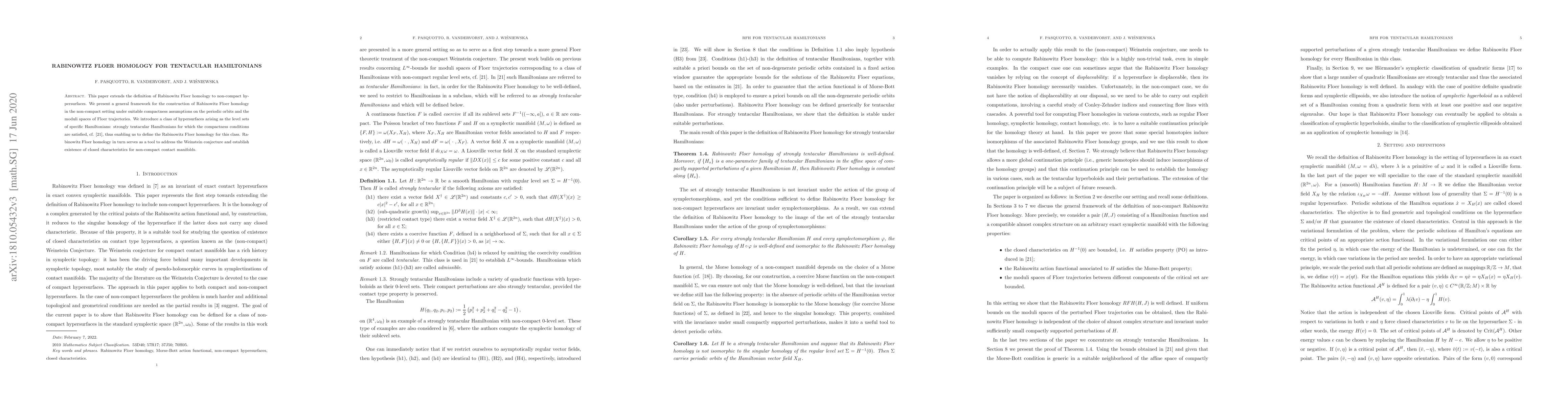 This paper extends Rabinowitz Floer homology to non-compact hypersurfaces, specifically for strongly tentacular Hamiltonians, and uses it to address the Weinstein conjecture and prove the existence of closed characteristics. The framework introduces compactness assumptions on periodic orbits and moduli spaces of Floer trajectories.