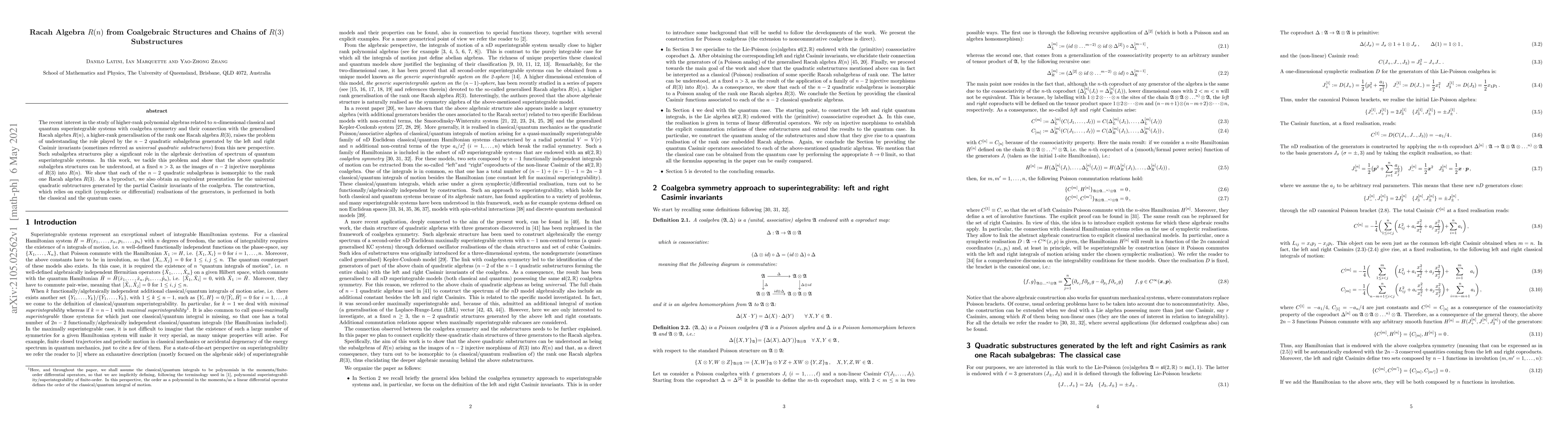 The recent interest in the study of higher-rank polynomial algebras related to $n$-dimensional classical and quantum superintegrable systems with coalgebra symmetry and their connection with the generalised Racah algebra $R(n)$, a higher-rank generalisation of the rank one Racah algebra $R(3)$, raises the problem of understanding the role played by the $n - 2$ quadratic subalgebras generated by the left and right Casimir invariants (sometimes referred as universal quadratic substructures) from this new perspective. Such subalgebra structures play a signficant role in the algebraic derivation of spectrum of quantum superintegrable systems. In this work, we tackle this problem and show that the above quadratic subalgebra structures can be understood, at a fixed $n > 3$, as the images of $n - 2$ injective morphisms of $R(3)$ into $R(n)$. We show that each of the $n-2$ quadratic subalgebras is isomorphic to the rank one Racah algebra $R(3)$. As a byproduct, we also obtain an equivalent presentation for the universal quadratic subtructures generated by the partial Casimir invariants of the coalgebra. The construction, which relies on explicit (symplectic or differential) realisations of the generators, is performed in both the classical and the quantum cases.