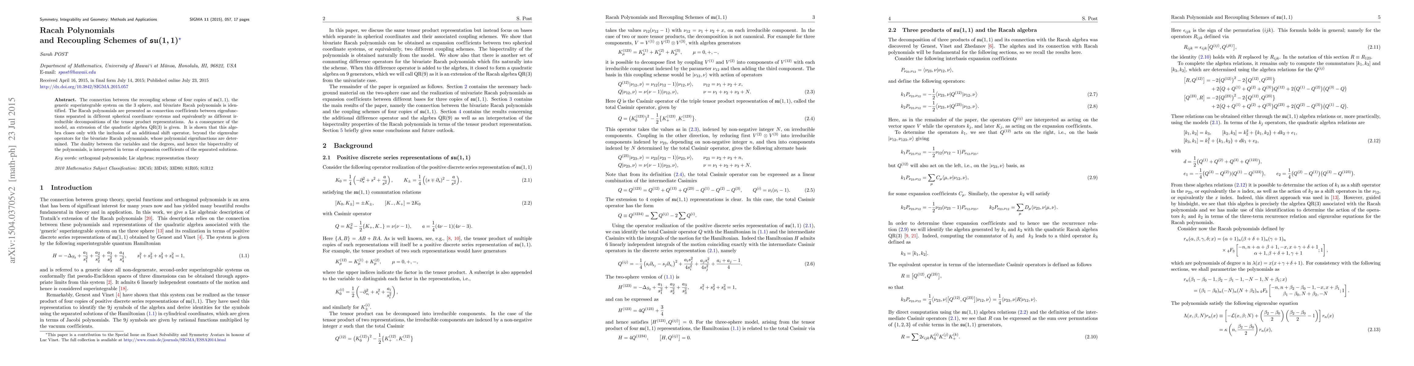 The connection between the recoupling scheme of four copies of $\mathfrak{su}(1,1)$, the generic superintegrable system on the 3 sphere, and bivariate Racah polynomials is identified. The Racah polynomials are presented as connection coefficients between eigenfunctions separated in different spherical coordinate systems and equivalently as different irreducible decompositions of the tensor product representations. As a consequence of the model, an extension of the quadratic algebra ${\rm QR}(3)$ is given. It is shown that this algebra closes only with the inclusion of an additional shift operator, beyond the eigenvalue operators for the bivariate Racah polynomials, whose polynomial eigenfunctions are determined. The duality between the variables and the degrees, and hence the bispectrality of the polynomials, is interpreted in terms of expansion coefficients of the separated solutions.