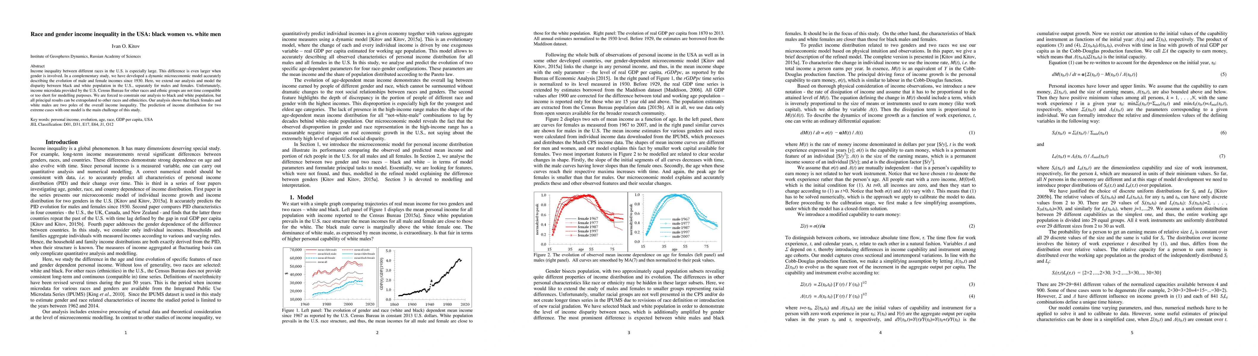 This study models the income inequality between black women and white men in the U.S., using a dynamic microeconomic model to analyze income evolution since 1930. It finds that black females and white males represent the extremes of income disparity, highlighting the significant impact of race and gender on income inequality.