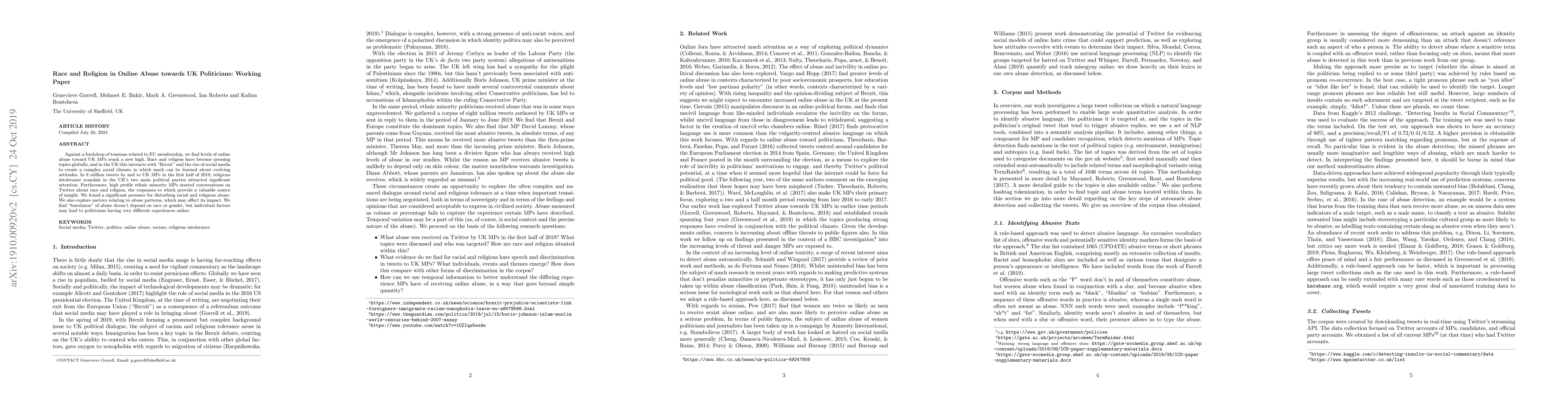 Against a backdrop of tensions related to EU membership, we find levels of online abuse toward UK MPs reach a new high. Race and religion have become pressing topics globally, and in the UK this interacts with "Brexit" and the rise of social media to create a complex social climate in which much can be learned about evolving attitudes. In 8 million tweets by and to UK MPs in the first half of 2019, religious intolerance scandals in the UK's two main political parties attracted significant attention. Furthermore, high profile ethnic minority MPs started conversations on Twitter about race and religion, the responses to which provide a valuable source of insight. We found a significant presence for disturbing racial and religious abuse. We also explore metrics relating to abuse patterns, which may affect its impact. We find "burstiness" of abuse doesn't depend on race or gender, but individual factors may lead to politicians having very different experiences online.