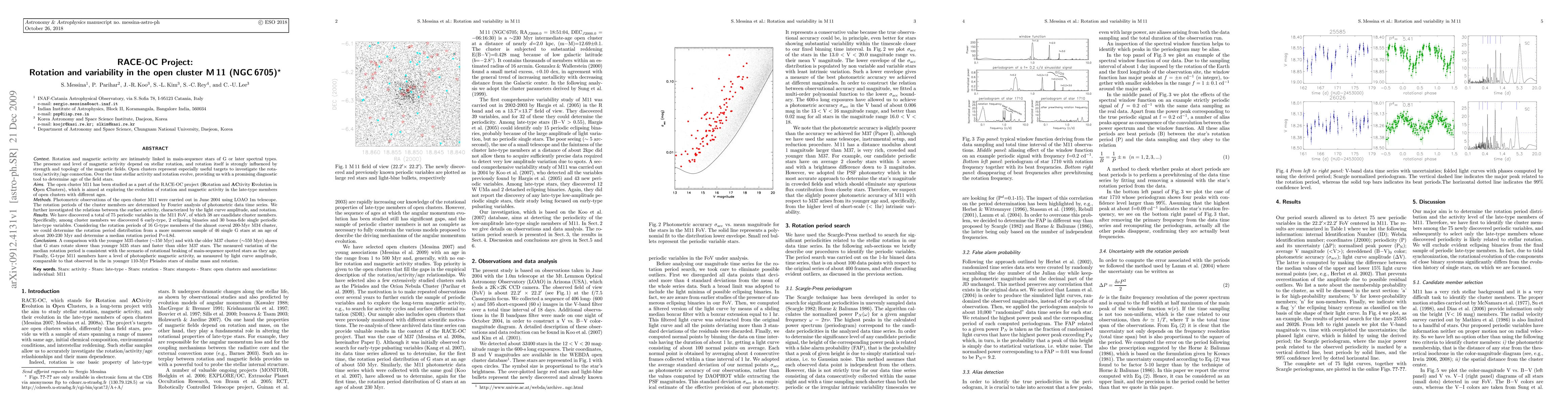 Rotation and magnetic activity are intimately linked in main-sequence stars of G or later spectral types. The presence and level of magnetic activity depend on stellar rotation, and rotation itself is strongly influenced by strength and topology of the magnetic fields. Open clusters represent especially useful targets to investigate the rotation/activity/age connection. The open cluster M11 has been studied as a part of the RACE-OC project (Rotation and ACtivity Evolution in Open Clusters), which is aimed at exploring the evolution of rotation and magnetic activity in the late-type members of open clusters with different ages. Photometric observations of the open cluster M11 were carried out in June 2004 using LOAO 1m telescope. The rotation periods of the cluster members are determined by Fourier analysis of photometric data time series. We further investigated the relations between the surface activity, characterized by the light curve amplitude, and rotation. We have discovered a total of 75 periodic variables in the M11 FoV, of which 38 are candidate cluster members. Specifically, among cluster members we discovered 6 early-type, 2 eclipsing binaries and 30 bona-fide single periodic late-type variables. Considering the rotation periods of 16 G-type members of the almost coeval 200-Myr M34 cluster, we could determine the rotation period distribution from a more numerous sample of 46 single G stars at an age of about 200-230 Myr and determine a median rotation period P=4.8d. A comparison with the younger M35 cluster (~150 Myr) and with the older M37 cluster (~550 Myr) shows that G stars rotate slower than younger M35 stars and faster than older M37 stars. The measured variation of the median rotation period is consistent with the scenario of rotational braking of main-sequence spotted stars as they age.