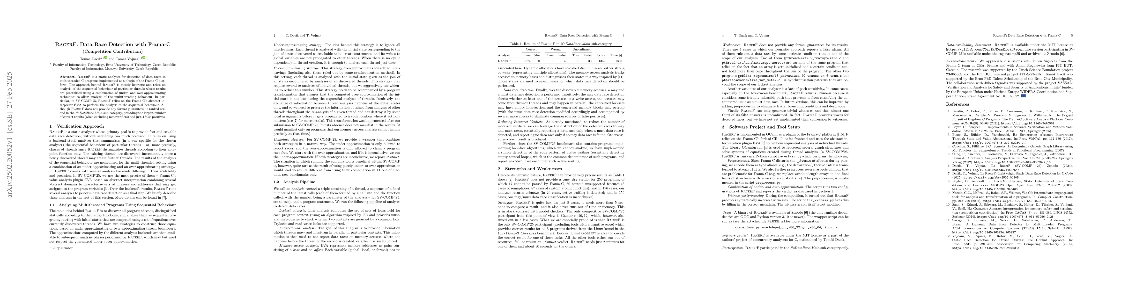RacerF is a heuristic static analyser plugin for Frama-C that detects data races in multithreaded C programs. It uses sequential behaviour analysis and generalisation techniques to handle multithreading, ranking second in the SV-COMP'25 NoDataRace-Main sub-category with few false positives.