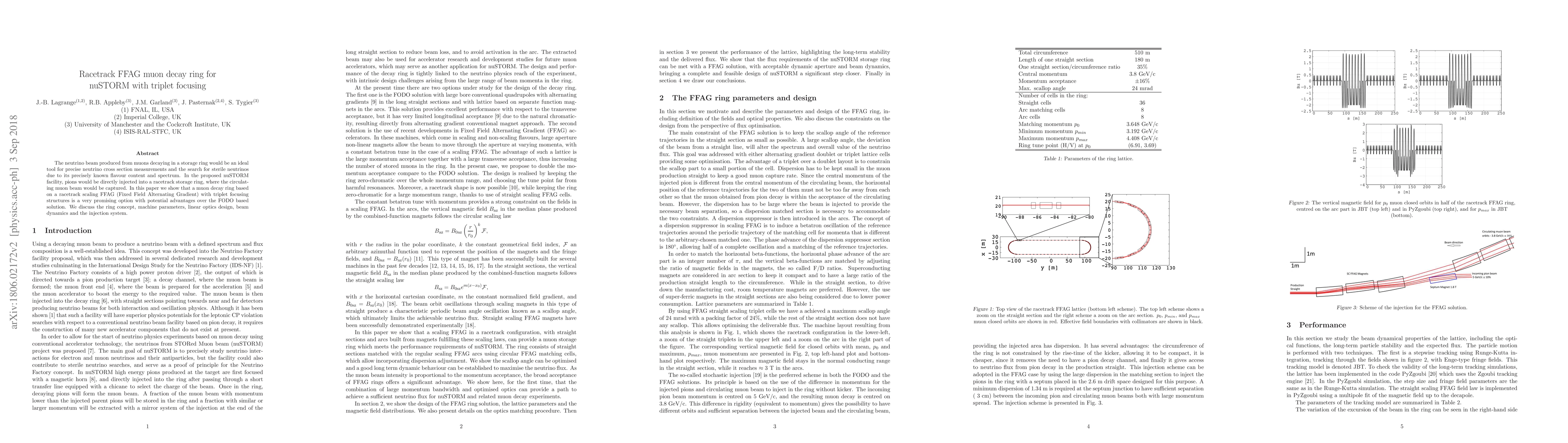 This paper proposes a racetrack FFAG muon decay ring for the nuSTORM facility, highlighting its potential advantages over FODO-based solutions. The design incorporates triplet focusing structures, detailing the ring concept, machine parameters, linear optics, beam dynamics, and injection system.