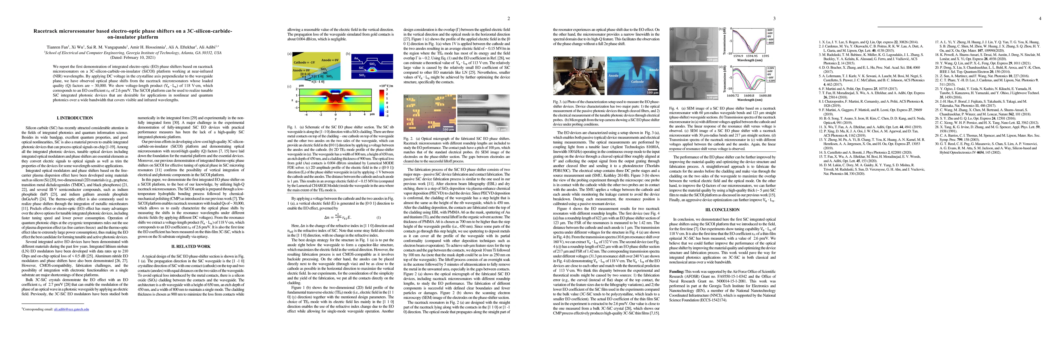 This paper demonstrates the first integrated electro-optic phase shifters based on racetrack microresonators on a 3C-silicon-carbide-on-insulator platform, achieving optical phase shifts with a quality factor of ~30,000 and a voltage-length product of 118 V·cm. The SiCOI platform enables tunable SiC photonic devices for various applications in nonlinear and quantum photonics.