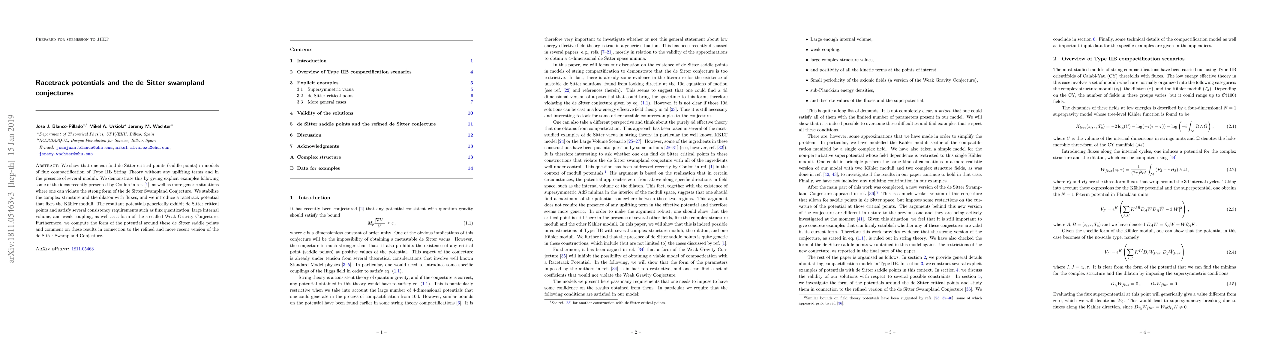 We show that one can find de Sitter critical points (saddle points) in models of flux compactification of Type IIB String Theory without any uplifting terms and in the presence of several moduli. We demonstrate this by giving explicit examples following some of the ideas recently presented by Conlon in [1], as well as more generic situations where one can violate the strong form of the de Sitter Swampland Conjecture. We stabilize the complex structure and the dilaton with fluxes, and we introduce a racetrack potential that fixes the K\"ahler moduli. The resultant potentials generically exhibit de Sitter critical points and satisfy several consistency requirements such as flux quantization, large internal volume, and weak coupling, as well as a form of the so-called Weak Gravity Conjecture. Furthermore, we compute the form of the potential around these de Sitter saddle points and comment on these results in connection to the refined and more recent version of the de Sitter Swampland Conjecture.