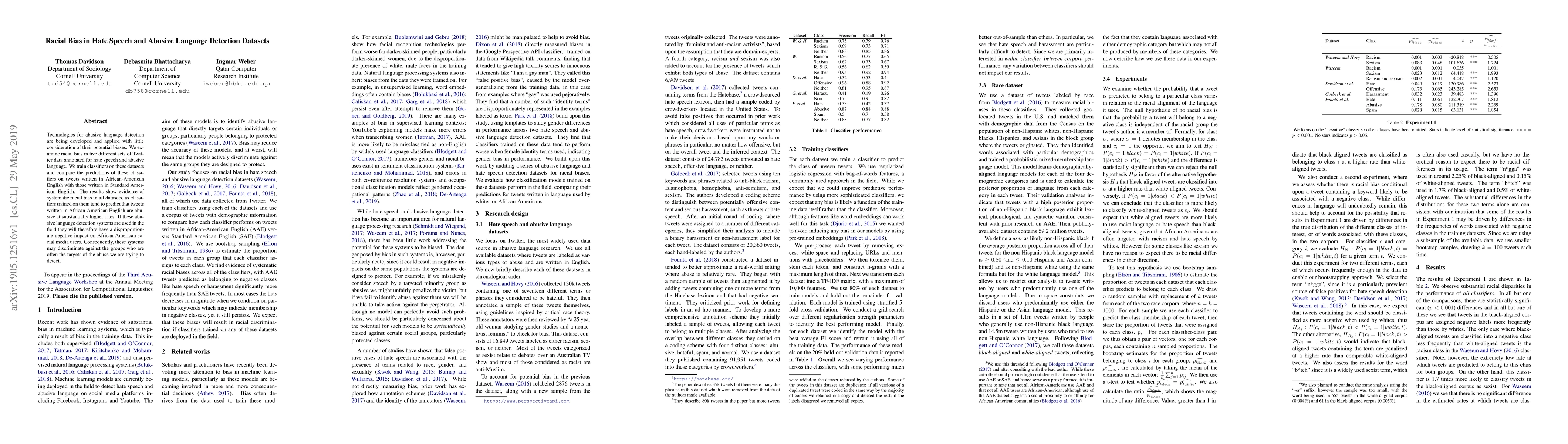 The research examines racial bias in five Twitter datasets annotated for hate speech and abusive language. Classifiers are trained on these datasets and compared for their predictions on tweets written in African-American English (AAE) versus Standard American English (SAE).
