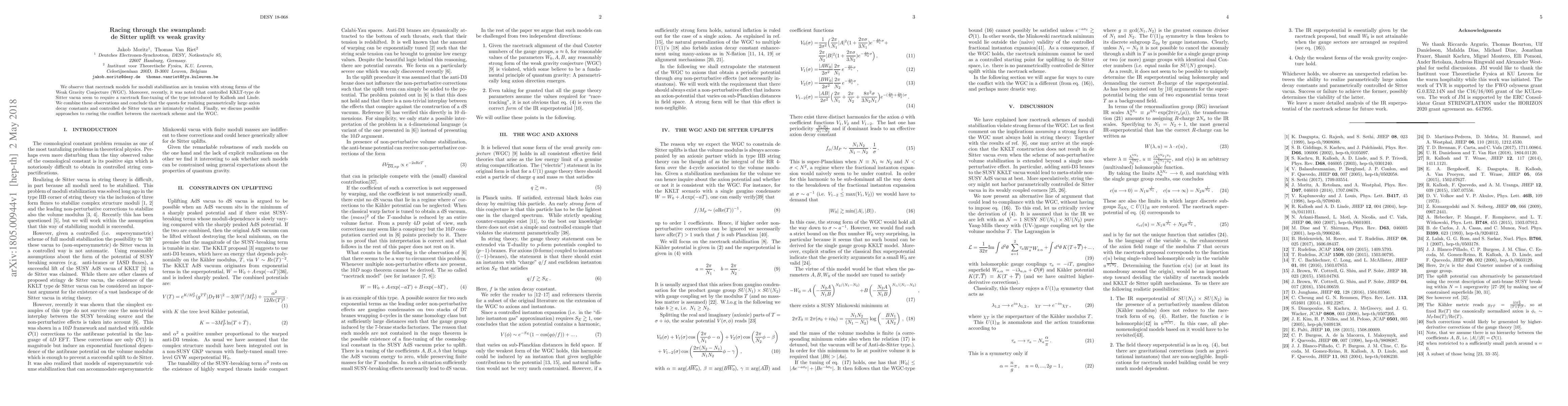 This paper explores the tension between racetrack models for moduli stabilization and the Weak Gravity Conjecture, noting that both require significant fine-tuning. It concludes that achieving large axion decay constants and controlled de Sitter vacua are inherently linked, and discusses potential solutions to reconcile these conflicting approaches.