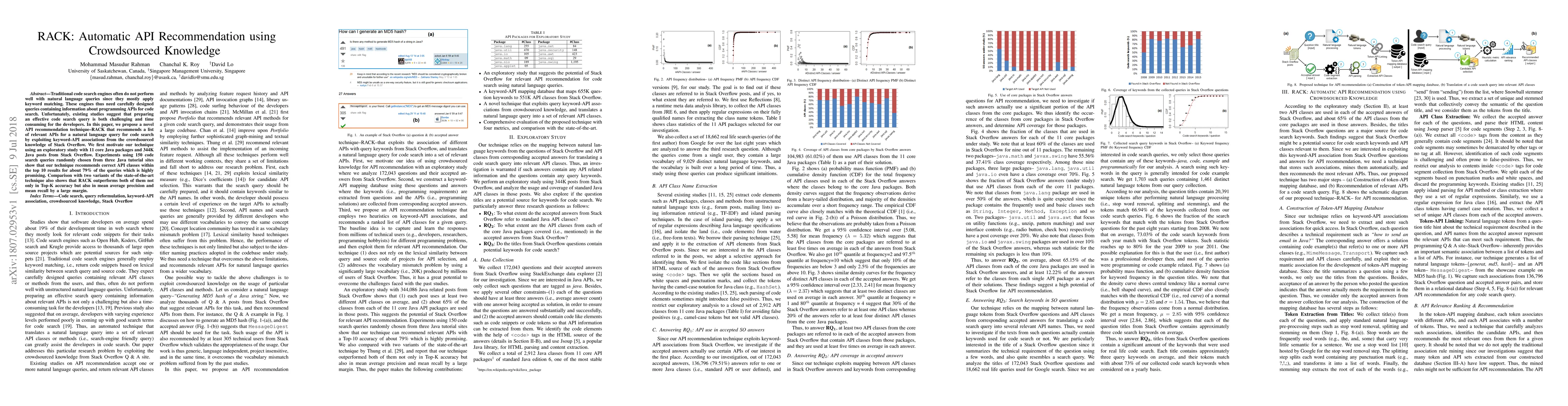 Traditional code search engines often do not perform well with natural language queries since they mostly apply keyword matching. These engines thus need carefully designed queries containing information about programming APIs for code search. Unfortunately, existing studies suggest that preparing an effective code search query is both challenging and time consuming for the developers. In this paper, we propose a novel API recommendation technique--RACK that recommends a list of relevant APIs for a natural language query for code search by exploiting keyword-API associations from the crowdsourced knowledge of Stack Overflow. We first motivate our technique using an exploratory study with 11 core Java packages and 344K Java posts from Stack Overflow. Experiments using 150 code search queries randomly chosen from three Java tutorial sites show that our technique recommends correct API classes within the top 10 results for about 79% of the queries which is highly promising. Comparison with two variants of the state-of-the-art technique also shows that RACK outperforms both of them not only in Top-K accuracy but also in mean average precision and mean recall by a large margin.