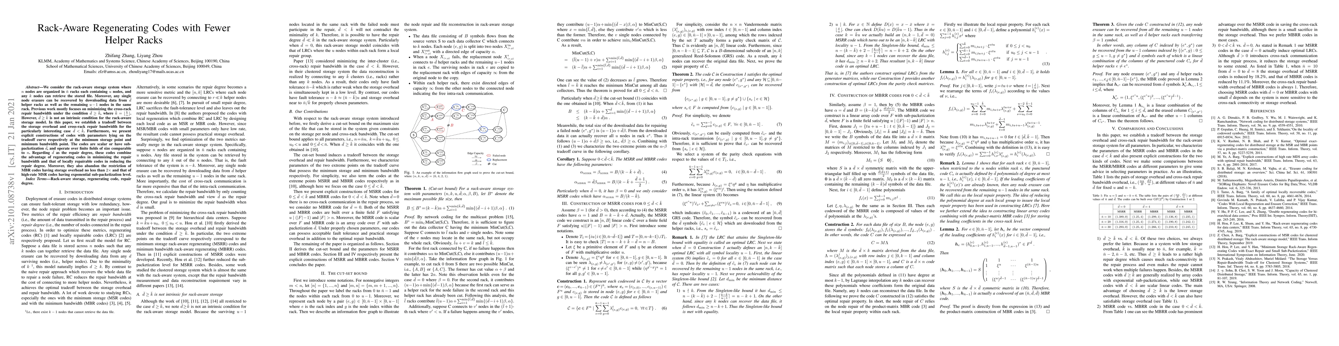 The paper establishes a tradeoff between storage overhead and cross-rack repair bandwidth for rack-aware storage systems, particularly when the repair degree \(\bar{d} < \bar{k}\). It presents explicit constructions of Minimum Storage Regenerating (MSRR) and Minimum Bandwidth Regenerating (MBRR) codes for parameters on the tradeoff curve at minimum storage and minimum bandwidth points.