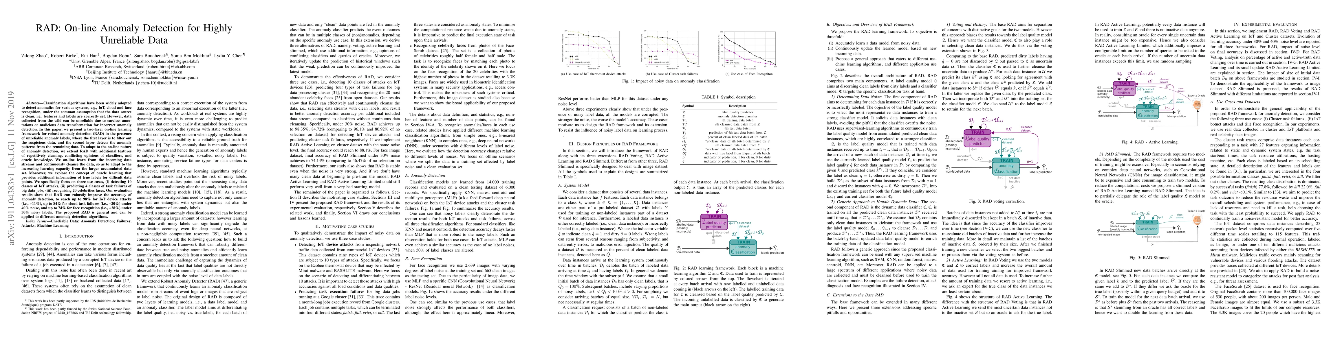 Classification algorithms have been widely adopted to detect anomalies for various systems, e.g., IoT, cloud and face recognition, under the common assumption that the data source is clean, i.e., features and labels are correctly set. However, data collected from the wild can be unreliable due to careless annotations or malicious data transformation for incorrect anomaly detection. In this paper, we present a two-layer on-line learning framework for robust anomaly detection (RAD) in the presence of unreliable anomaly labels, where the first layer is to filter out the suspicious data, and the second layer detects the anomaly patterns from the remaining data. To adapt to the on-line nature of anomaly detection, we extend RAD with additional features of repetitively cleaning, conflicting opinions of classifiers, and oracle knowledge. We on-line learn from the incoming data streams and continuously cleanse the data, so as to adapt to the increasing learning capacity from the larger accumulated data set. Moreover, we explore the concept of oracle learning that provides additional information of true labels for difficult data points. We specifically focus on three use cases, (i) detecting 10 classes of IoT attacks, (ii) predicting 4 classes of task failures of big data jobs, (iii) recognising 20 celebrities faces. Our evaluation results show that RAD can robustly improve the accuracy of anomaly detection, to reach up to 98% for IoT device attacks (i.e., +11%), up to 84% for cloud task failures (i.e., +20%) under 40% noise, and up to 74% for face recognition (i.e., +28%) under 30% noisy labels. The proposed RAD is general and can be applied to different anomaly detection algorithms.