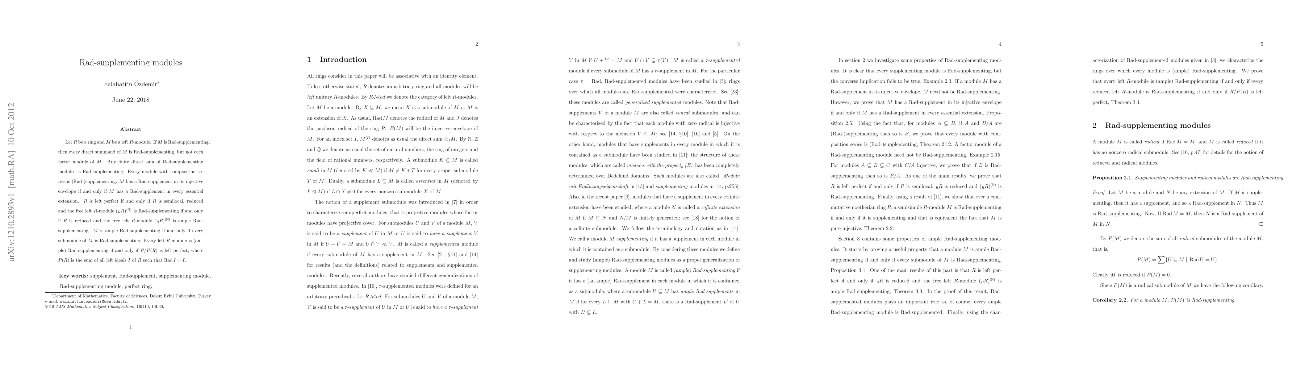 Let R be an associative ring with unity and let M be an R-module. We call M (ample) Rad-supplementing if M has a (ample) Rad-supplement in every extension. If M is Rad-supplementing, then every direct summand of M is Rad-supplementing, but not each factor module of M. Every module with composition series is (Rad-)supplementing. M has a Rad-supplement in its injective envelope if and only if M has a Rad-supplement in every essential extension. R is left perfect if and only if R is semilocal and reduced, and the direct sum of countably many copies of R is Rad-supplementing if and only if R is reduced and the direct sum of countably many copies of R is ample Rad-supplementing. M is ample Rad-supplementing if and only if every submodule of M is Rad-supplementing. Every left R-module is (ample) Rad-supplementing if and only if R/P(R) is a left perfect ring, where P(R) is the sum of all left ideals of R such that Rad I=I.