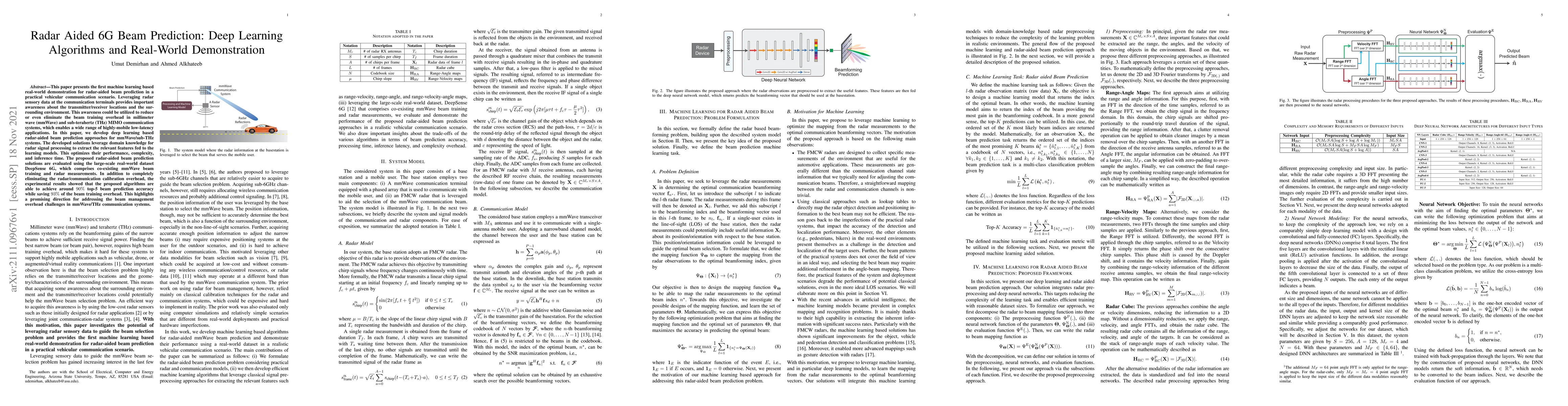 First real-world demonstration of radar-aided beam prediction using deep learning algorithms, optimizing performance, complexity, and inference time with radar signal processing features.