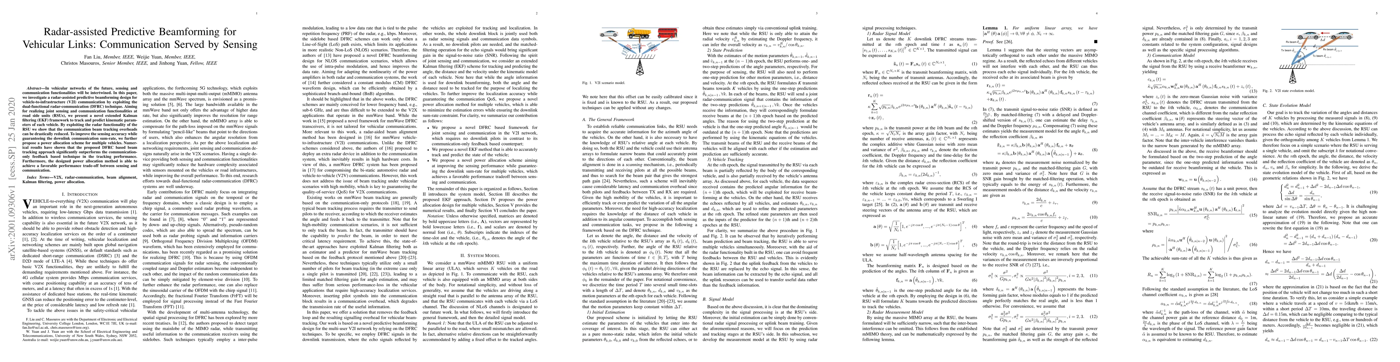 This paper proposes a radar-assisted predictive beamforming technique for vehicle-to-infrastructure communication using dual-functional radar-communication (DFRC) to integrate sensing and communication. An extended Kalman filter framework is developed to track vehicle kinematics, reducing communication overheads and improving sensing accuracy while optimizing power allocation for multiple vehicles.