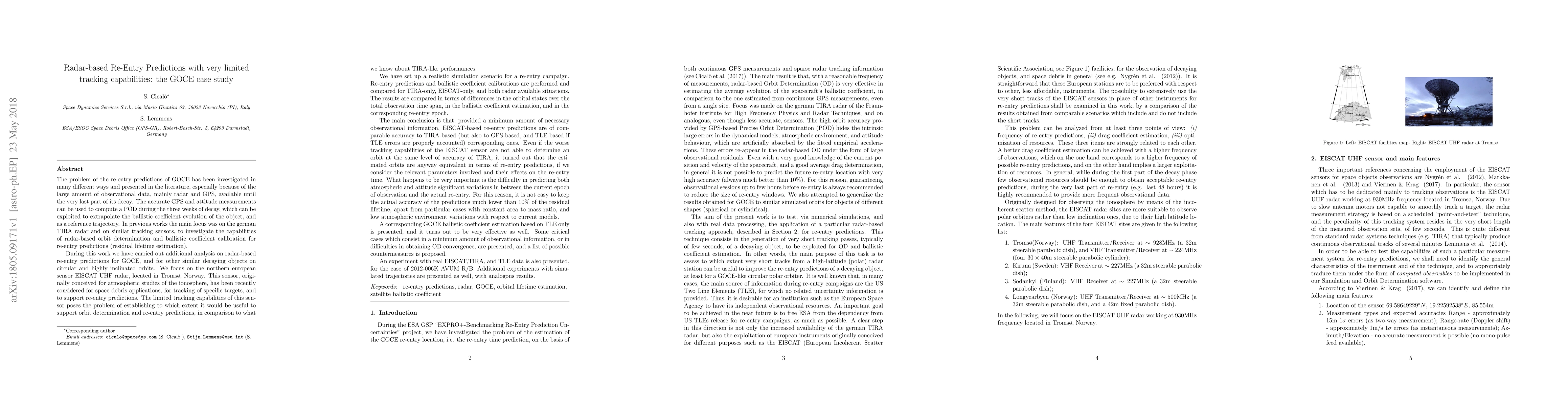 The problem of the re-entry predictions of GOCE has been deeply investigated in the literature, due to the large amount of data, mainly radar and GPS, available until re-entry. The accurate GPS and attitude measurements are used to compute a precise reference orbit for the three weeks of decay, and to extrapolate the ballistic coefficient evolution of the object. In previous works, the capabilities of radar-based solutions for the re-entry predictions of GOCE and of similar objects were investigated, focusing on the german TIRA radar. In this work we have performed additional analysis, focusing on the northern european radar EISCAT-UHF, located in Troms\o, Norway. This sensor, conceived for atmospheric studies, has recently been considered for space debris applications. Due to its limited tracking capabilities, we are interested in testing its effectiveness in supporting re-entry predictions. We have simulated reliable re-entry prediction scenarios, with different availability of data from EISCAT and TIRA. The main conclusion is that, provided a suitable amount of observations, EISCAT-based re-entry predictions are comparable to TIRA-based, but also to GPS and TLE-based, corresponding ones. In general, EISCAT is not able to determine an orbit with the same accuracy of TIRA, but the results are equivalent in terms of re-entry predictions, if we consider the relevant parameters involved and their effects on the re-entry time. What is very important is the difficulty in predicting atmospheric and attitude significant variations in between the current epoch and the actual re-entry. Thus, it is not easy to keep the accuracy of predictions much lower than 10% of the residual lifetime, apart from cases with constant area to mass ratio, and low atmospheric variations with respect to the models. An experiment with real data is presented for the object 2012-006K, with consistent results.