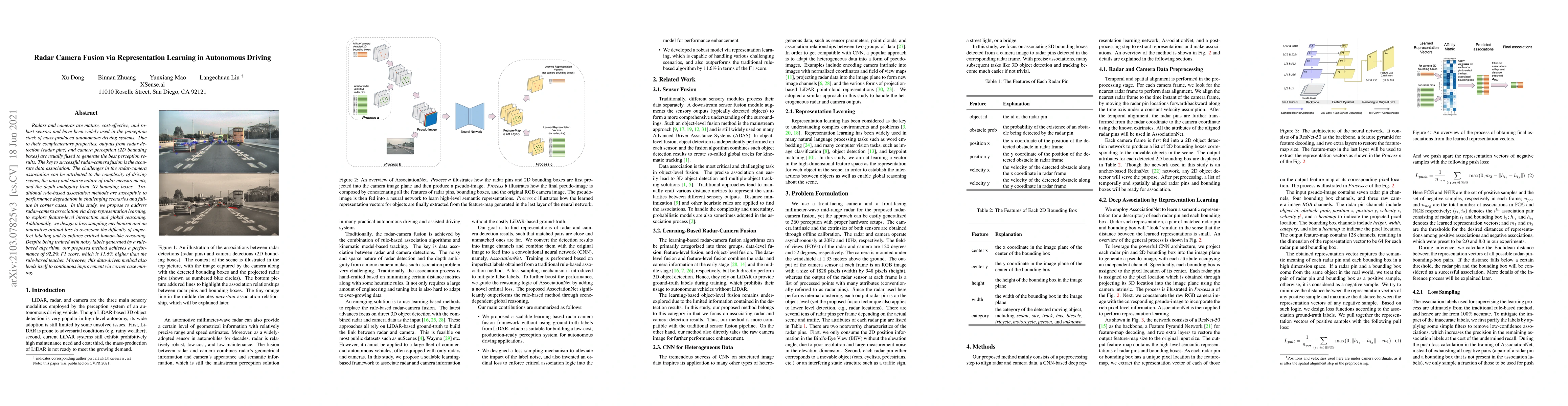 This paper proposes a deep representation learning approach for radar-camera fusion in autonomous driving, addressing data association challenges through feature-level interaction and global reasoning. Despite training with noisy labels, the method achieves a 92.2% F1 score, outperforming traditional rule-based methods by 11.6%.