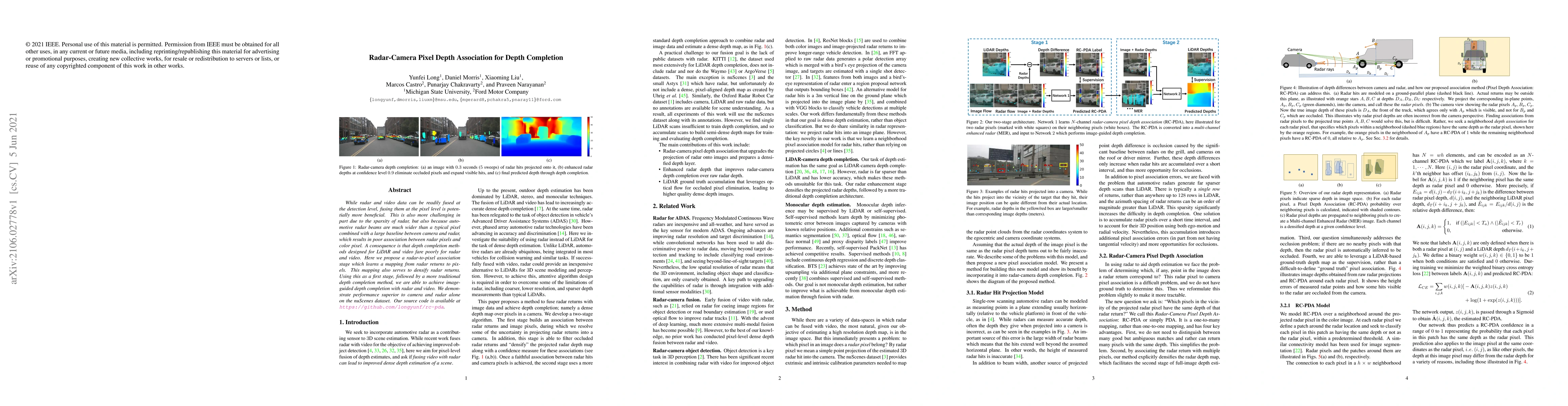 While radar and video data can be readily fused at the detection level, fusing them at the pixel level is potentially more beneficial. This is also more challenging in part due to the sparsity of radar, but also because automotive radar beams are much wider than a typical pixel combined with a large baseline between camera and radar, which results in poor association between radar pixels and color pixel. A consequence is that depth completion methods designed for LiDAR and video fare poorly for radar and video. Here we propose a radar-to-pixel association stage which learns a mapping from radar returns to pixels. This mapping also serves to densify radar returns. Using this as a first stage, followed by a more traditional depth completion method, we are able to achieve image-guided depth completion with radar and video. We demonstrate performance superior to camera and radar alone on the nuScenes dataset. Our source code is available at https://github.com/longyunf/rc-pda.