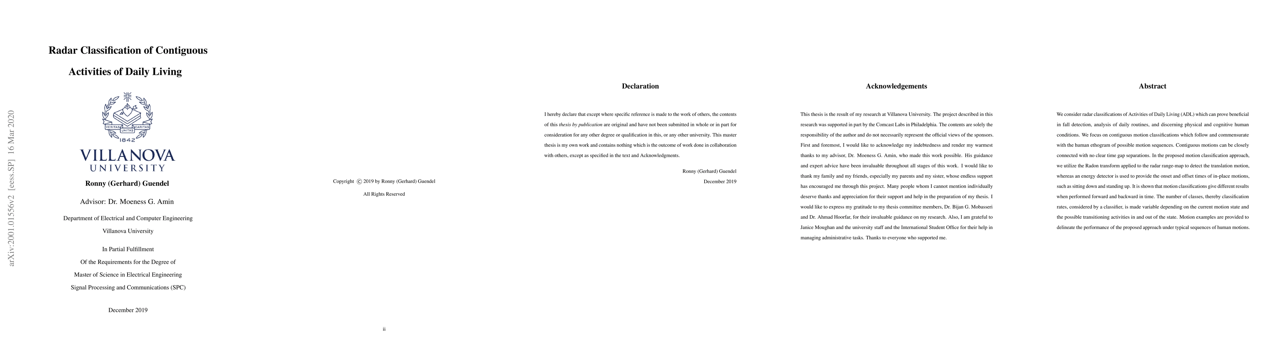 This paper proposes a radar-based method for classifying contiguous Activities of Daily Living (ADL) using the Radon transform and energy detection to identify motion sequences. The approach dynamically adjusts the number of classes based on current and transitioning activities, demonstrating different classification results when analyzed forward and backward in time.