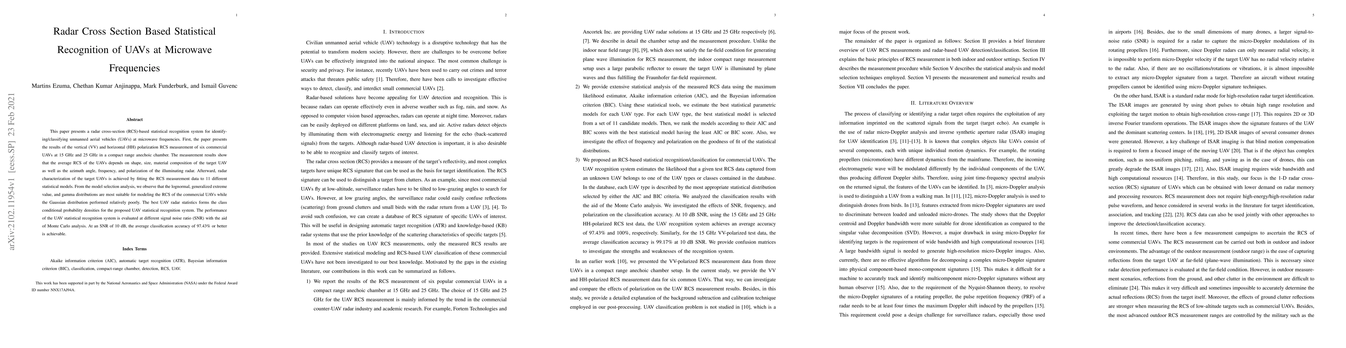 This paper develops a radar cross-section (RCS)-based statistical recognition system for classifying UAVs at microwave frequencies, finding that lognormal, generalized extreme value, and gamma distributions best model the RCS data. The system achieves an average classification accuracy of 97.43% or higher at 10 dB SNR.
