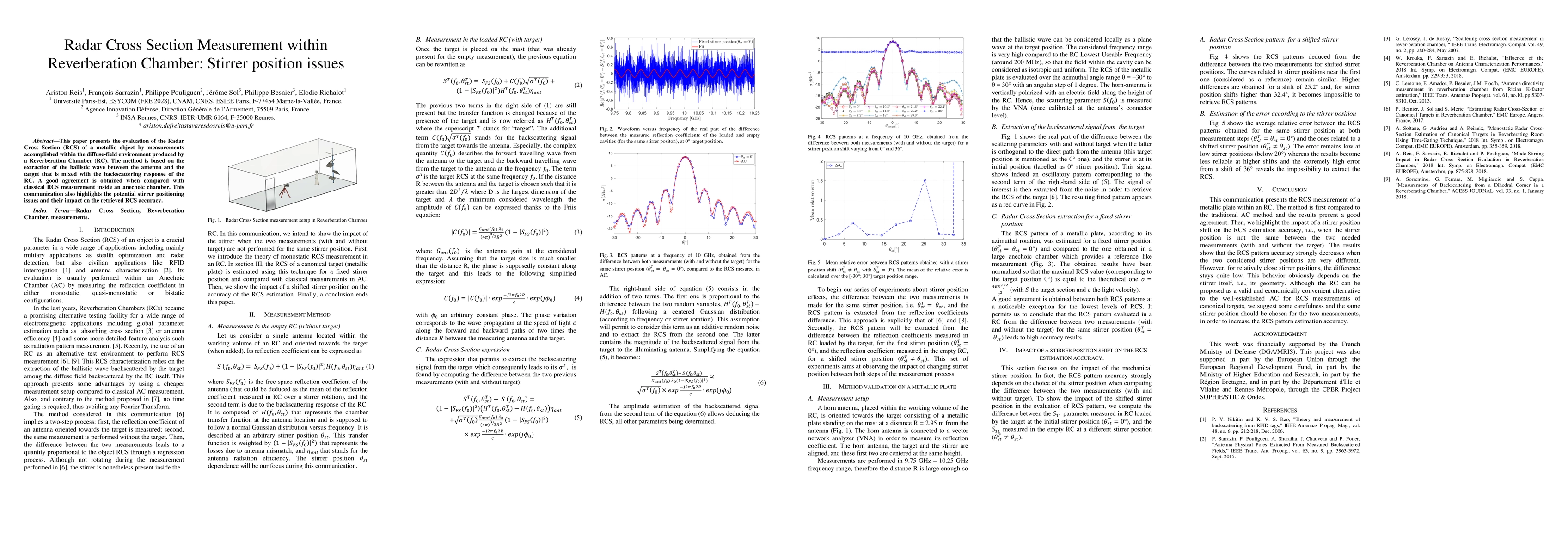 This paper evaluates the Radar Cross Section (RCS) of metallic objects using a Reverberation Chamber, finding good agreement with anechoic chamber measurements, while also addressing stirrer positioning issues that affect RCS accuracy.