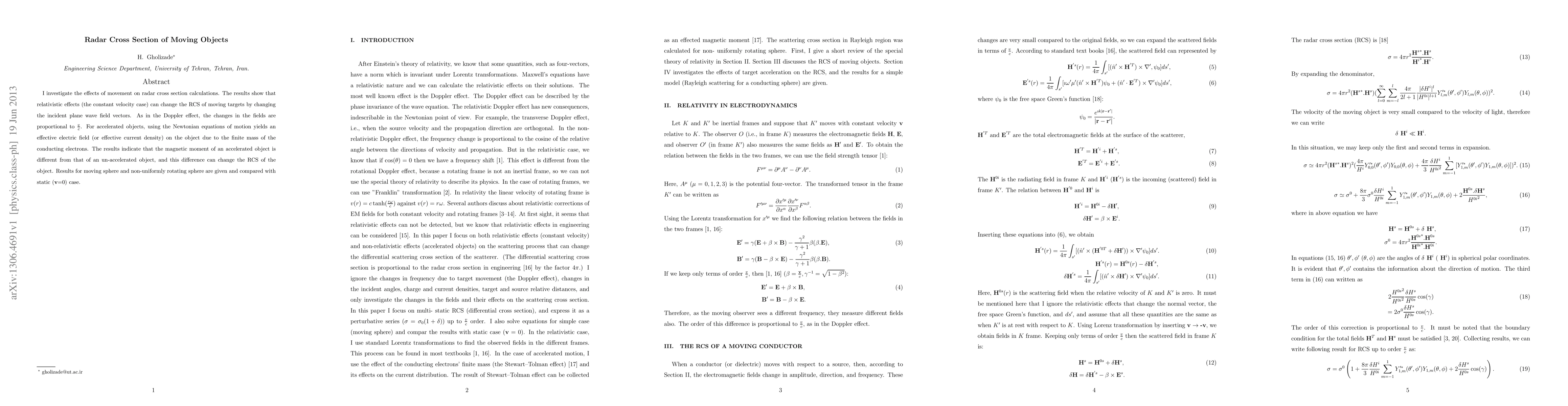 This paper investigates how movement affects radar cross section (RCS) calculations, revealing that relativistic effects can alter RCS by changing incident plane wave field vectors. For accelerated objects, Newtonian equations of motion produce an effective electric field, leading to a different magnetic moment and thus a modified RCS compared to static objects.
