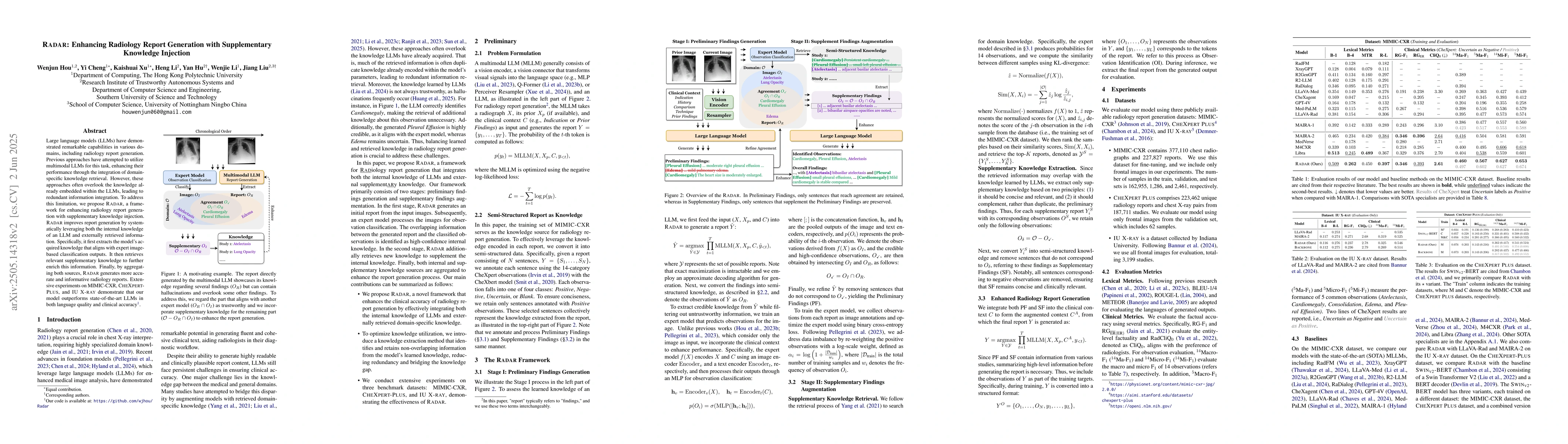 The research proposes RADAR, a framework that enhances radiology report generation by systematically leveraging both the internal knowledge of a large language model (LLM) and externally retrieved information, improving accuracy and informativeness of reports.