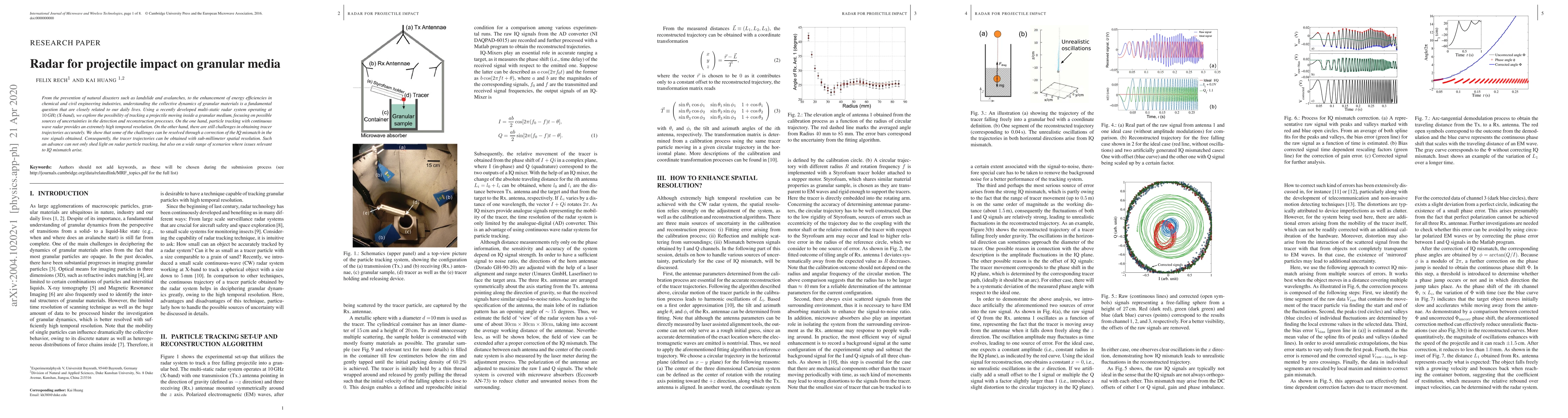From the prevention of natural disasters such as landslide and avalanches, to the enhancement of energy efficiencies in chemical and civil engineering industries, understanding the collective dynamics of granular materials is a fundamental question that are closely related to our daily lives. Using a recently developed multi-static radar system operating at $10$\,GHz (X-band), we explore the possibility of tracking a projectile moving inside a granular medium, focusing on possible sources of uncertainties in the detection and reconstruction processes. On the one hand, particle tracking with continuous wave radar provides an extremely high temporal resolution. On the other hand, there are still challenges in obtaining tracer trajectories accurately. We show that some of the challenges can be resolved through a correction of the IQ mismatch in the raw signals obtained. Consequently, the tracer trajectories can be obtained with sub-millimeter spatial resolution. Such an advance can not only shed light on radar particle tracking, but also on a wide range of scenarios where issues relevant to IQ mismatch arise.
