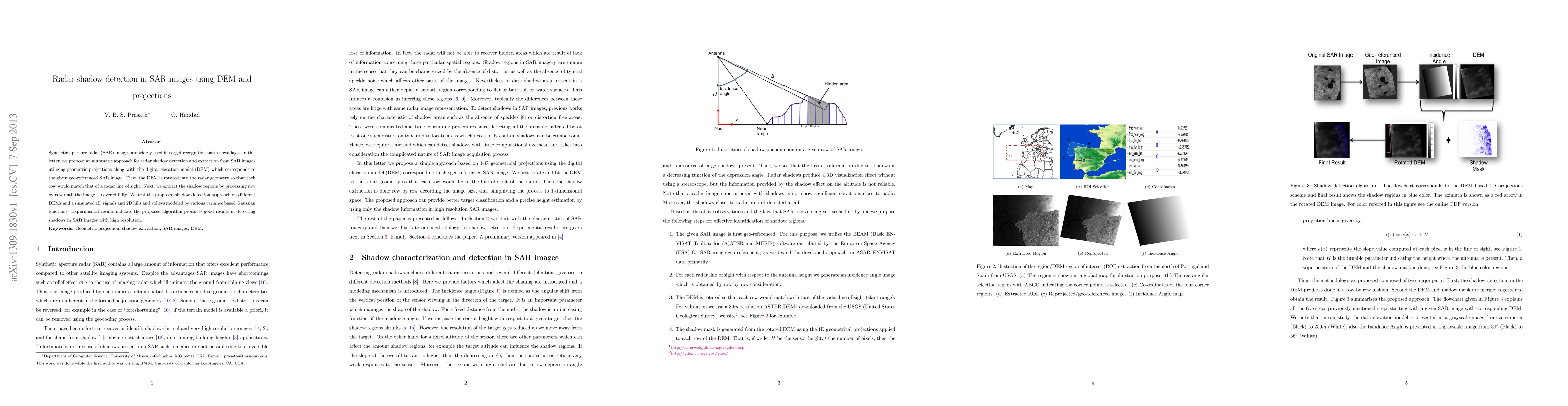 This paper proposes an automatic method for detecting radar shadows in SAR images using geometric projections and a digital elevation model (DEM). The DEM is aligned with radar geometry, and shadow regions are extracted row by row, demonstrating high-resolution accuracy in experimental results.