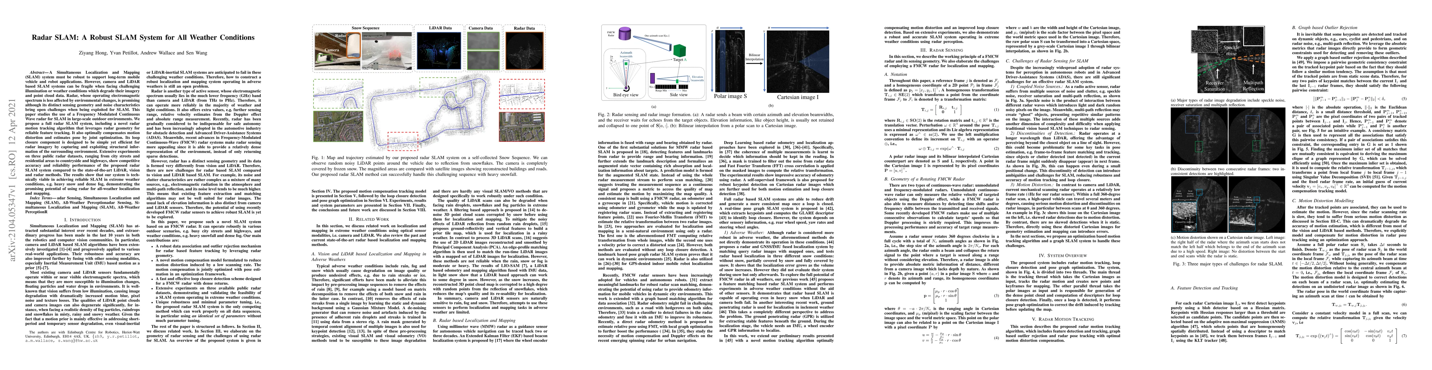 A Simultaneous Localization and Mapping (SLAM) system must be robust to support long-term mobile vehicle and robot applications. However, camera and LiDAR based SLAM systems can be fragile when facing challenging illumination or weather conditions which degrade their imagery and point cloud data. Radar, whose operating electromagnetic spectrum is less affected by environmental changes, is promising although its distinct sensing geometry and noise characteristics bring open challenges when being exploited for SLAM. % However, there are still open challenges since most existing visual and LiDAR SLAM systems do not operate in bad weathers. This paper studies the use of a Frequency Modulated Continuous Wave radar for SLAM in large-scale outdoor environments. We propose a full radar SLAM system, including a novel radar motion tracking algorithm that leverages radar geometry for reliable feature tracking. It also optimally compensates motion distortion and estimates pose by joint optimization. Its loop closure component is designed to be simple yet efficient for radar imagery by capturing and exploiting structural information of the surrounding environment. % while a scheme to reject ambiguous loop closure candidates is also designed specifically for radar. Extensive experiments on three public radar datasets, ranging from city streets and residential areas to countryside and highways, show competitive accuracy and reliability performance of the proposed radar SLAM system compared to the state-of-the-art LiDAR, vision and radar methods. The results show that our system is technically viable in achieving reliable SLAM in extreme weather conditions, e.g. heavy snow and dense fog, demonstrating the promising potential of using radar for all-weather localization and mapping.