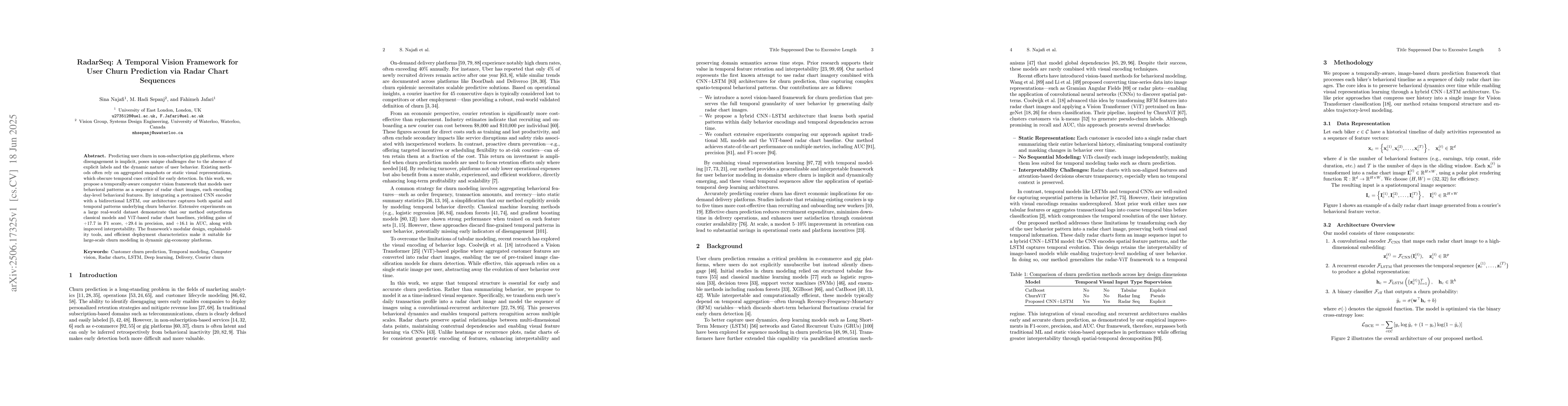 Predicting user churn in non-subscription gig platforms, where disengagement is implicit, poses unique challenges due to the absence of explicit labels and the dynamic nature of user behavior. Existing methods often rely on aggregated snapshots or static visual representations, which obscure temporal cues critical for early detection. In this work, we propose a temporally-aware computer vision framework that models user behavioral patterns as a sequence of radar chart images, each encoding day-level behavioral features. By integrating a pretrained CNN encoder with a bidirectional LSTM, our architecture captures both spatial and temporal patterns underlying churn behavior. Extensive experiments on a large real-world dataset demonstrate that our method outperforms classical models and ViT-based radar chart baselines, yielding gains of 17.7 in F1 score, 29.4 in precision, and 16.1 in AUC, along with improved interpretability. The framework's modular design, explainability tools, and efficient deployment characteristics make it suitable for large-scale churn modeling in dynamic gig-economy platforms.