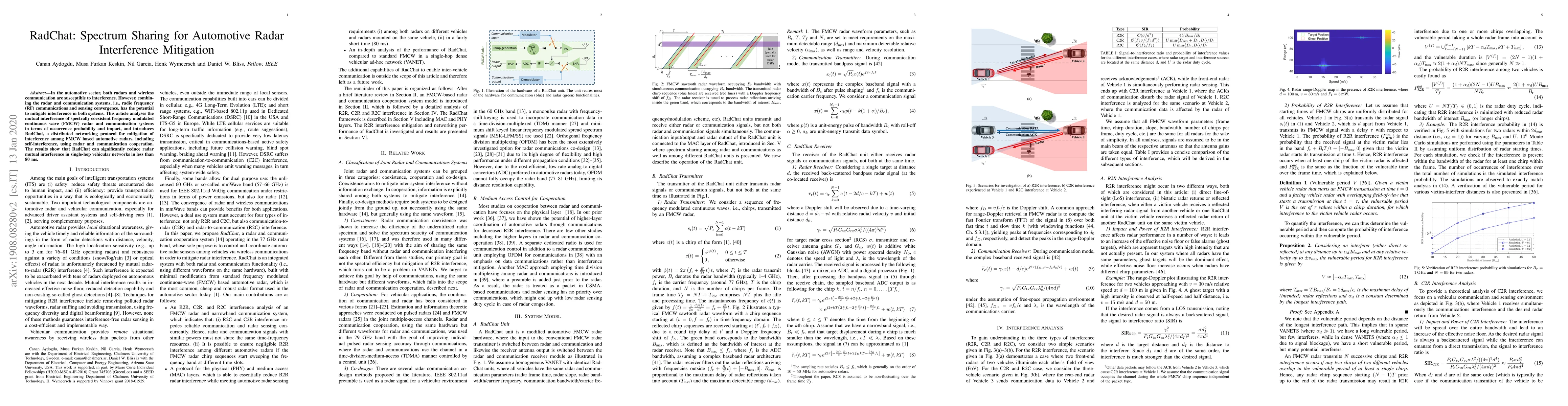 In the automotive sector, both radars and wireless communication are susceptible to interference. However, combining the radar and communication systems, i.e., radio frequency (RF) communications and sensing convergence, has the potential to mitigate interference in both systems. This article analyses the mutual interference of spectrally coexistent frequency modulated continuous wave (FMCW) radar and communication systems in terms of occurrence probability and impact, and introduces RadChat, a distributed networking protocol for mitigation of interference among FMCW based automotive radars, including self-interference, using radar communications. The results show that RadChat can significantly reduce radar mutual interference in single-hop vehicular networks in less than 80 ms.