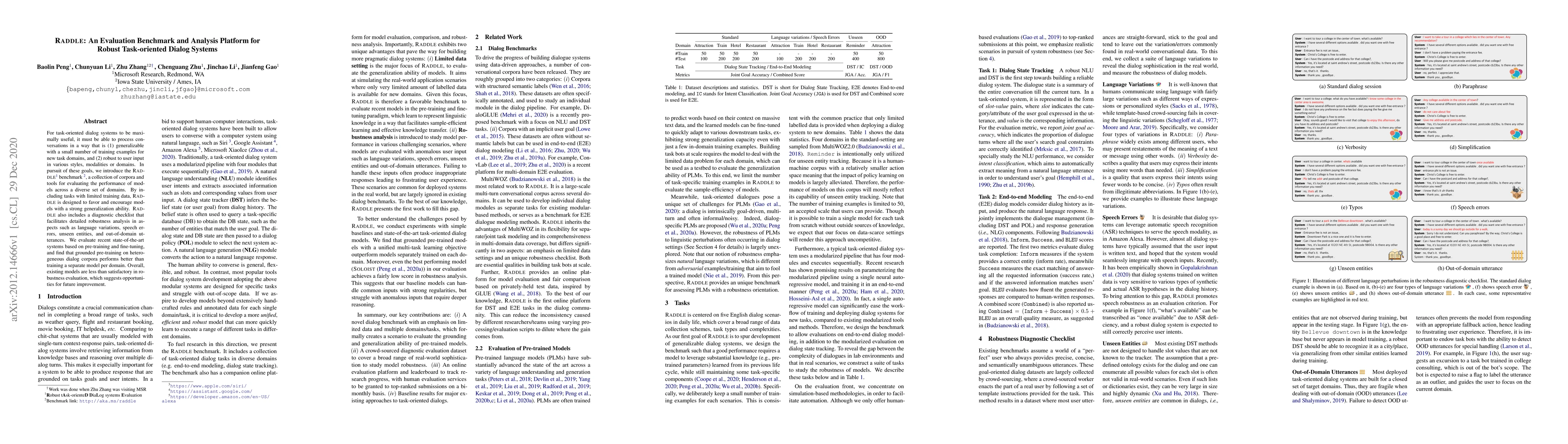 The paper introduces RADDLE, a benchmark and platform for assessing robustness in task-oriented dialog systems. It emphasizes generalization with minimal training data and resistance to varied user inputs. Evaluations reveal current models lack robustness, highlighting potential for future advancements, especially in grounded pre-training on diverse dialog corpora.