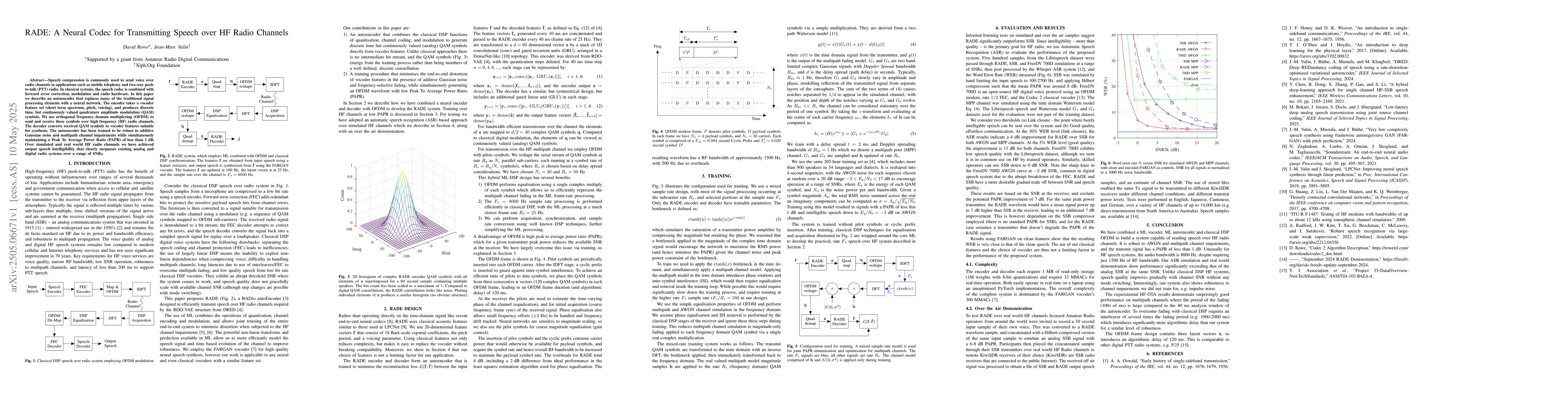 This paper introduces RADE, a neural codec for transmitting speech over HF radio channels. It uses an autoencoder that combines speech encoding, error correction, and modulation into a single neural network, outperforming traditional systems in intelligibility over simulated and real-world HF radio channels across various SNRs.