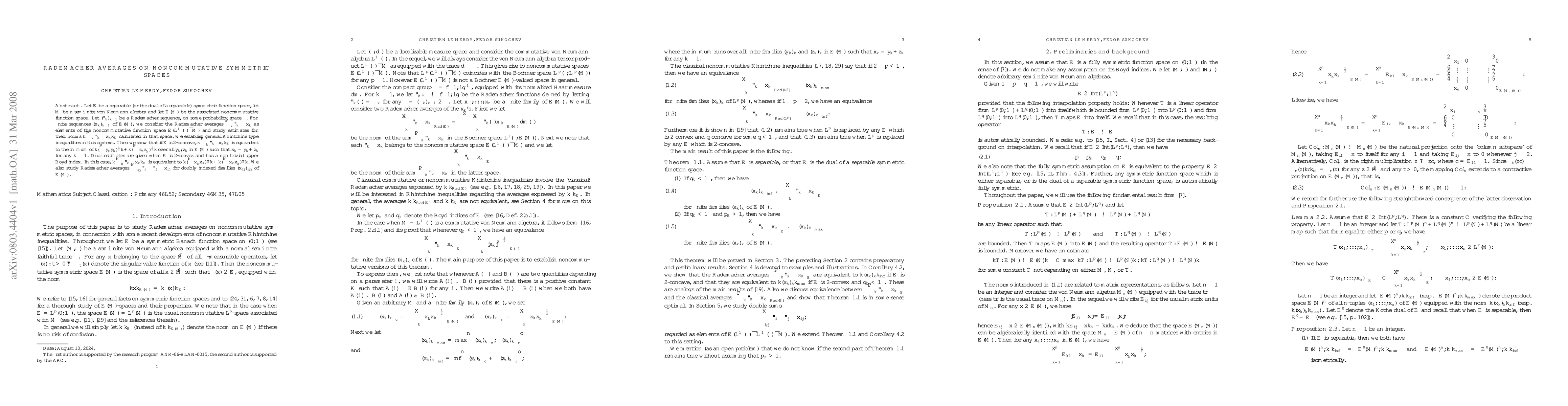 Let E be a separable (or the dual of a separable) symmetric function space, let M be a semifinite von Neumann algebra and let E(M) be the associated noncommutative function space. Let $(\epsilon_k)_k$ be a Rademacher sequence, on some probability space $\Omega$. For finite sequences $(x_k)_k of E(M), we consider the Rademacher averages $\sum_k \epsilon_k\otimes x_k$ as elements of the noncommutative function space $E(L^\infty(\Omega)\otimes M)$ and study estimates for their norms $\Vert \sum_k \epsilon_k \otimes x_k\Vert_E$ calculated in that space. We establish general Khintchine type inequalities in this context. Then we show that if E is 2-concave, the latter norm is equivalent to the infimum of $\Vert (\sum y_k^*y_k)^{{1/2}}\Vert + \Vert (\sum z_k z_k^*)^{{1/2}}\Vert$ over all $y_k,z_k$ in E(M) such that $x_k=y_k+z_k$ for any k. Dual estimates are given when E is 2-convex and has a non trivial upper Boyd index. We also study Rademacher averages for doubly indexed families of E(M).