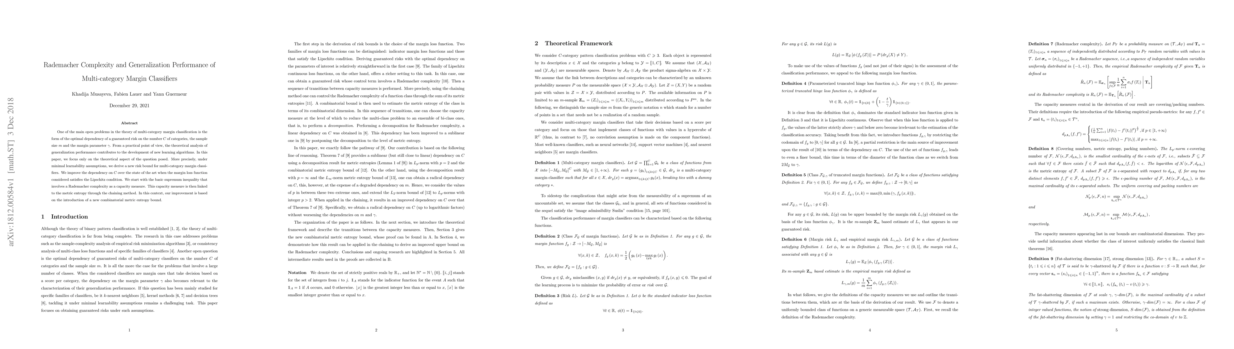 One of the main open problems in the theory of multi-category margin classification is the form of the optimal dependency of a guaranteed risk on the number C of categories, the sample size m and the margin parameter gamma. From a practical point of view, the theoretical analysis of generalization performance contributes to the development of new learning algorithms. In this paper, we focus only on the theoretical aspect of the question posed. More precisely, under minimal learnability assumptions, we derive a new risk bound for multi-category margin classifiers. We improve the dependency on C over the state of the art when the margin loss function considered satisfies the Lipschitz condition. We start with the basic supremum inequality that involves a Rademacher complexity as a capacity measure. This capacity measure is then linked to the metric entropy through the chaining method. In this context, our improvement is based on the introduction of a new combinatorial metric entropy bound.