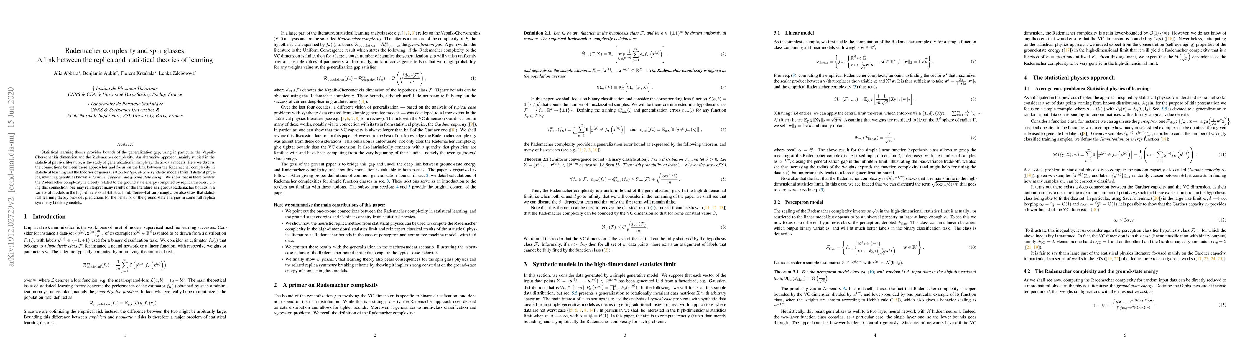 This paper establishes a connection between the Rademacher complexity in statistical learning theory and the theories of generalization in statistical physics, particularly relating it to the Gardner capacity and ground state energy in spin glasses. It reinterprets results from statistical physics as rigorous Rademacher bounds in high-dimensional limits, and shows that statistical learning theory can predict ground-state energy behaviors in certain complex models.