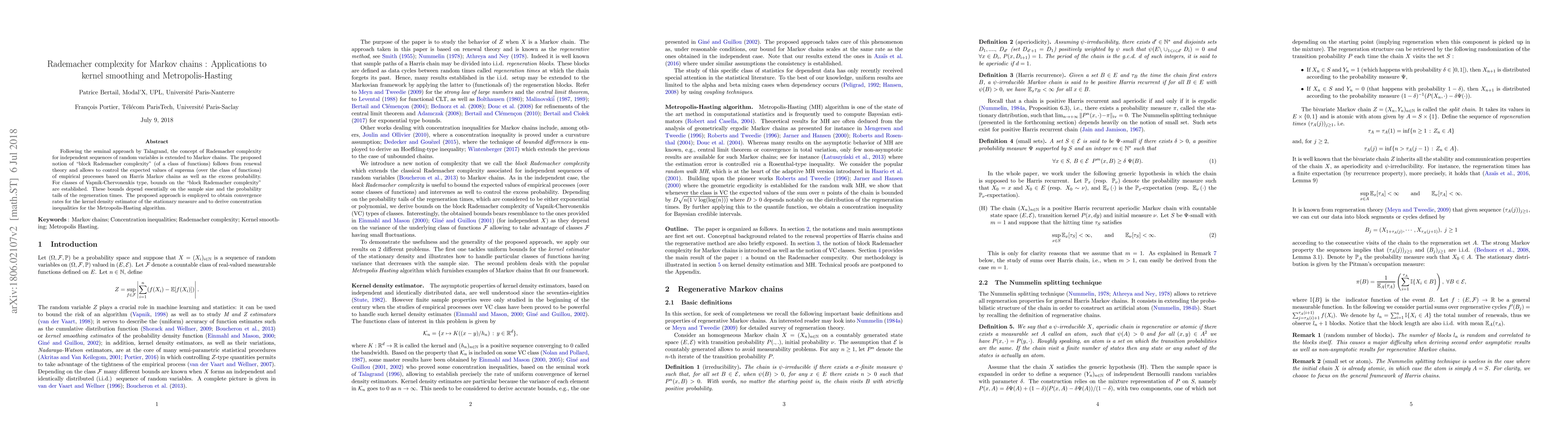 The paper extends the concept of Rademacher complexity from independent sequences to Markov chains, introducing 'block Rademacher complexity' based on renewal theory for controlling suprema of empirical processes. It applies this to kernel density estimation and Metropolis-Hasting algorithm convergence rates.