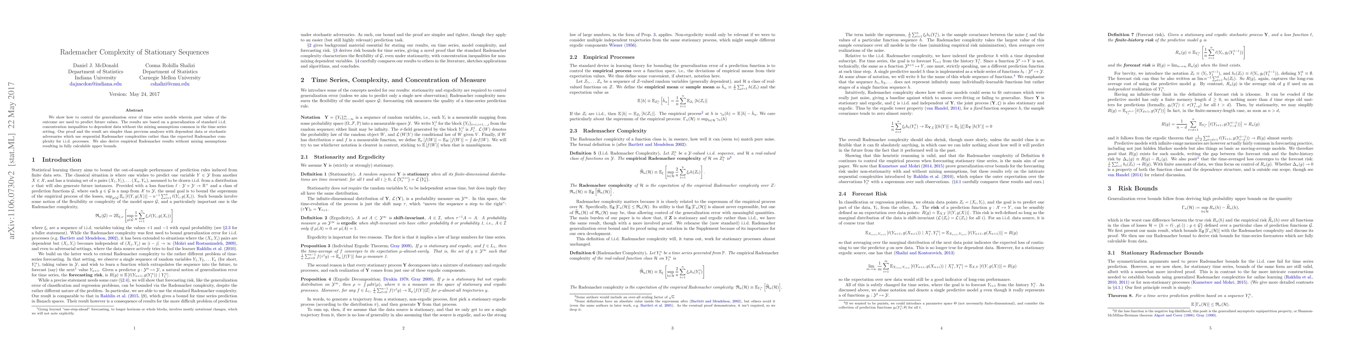 We show how to control the generalization error of time series models wherein past values of the outcome are used to predict future values. The results are based on a generalization of standard i.i.d. concentration inequalities to dependent data without the mixing assumptions common in the time series setting. Our proof and the result are simpler than previous analyses with dependent data or stochastic adversaries which use sequential Rademacher complexities rather than the expected Rademacher complexity for i.i.d. processes. We also derive empirical Rademacher results without mixing assumptions resulting in fully calculable upper bounds.