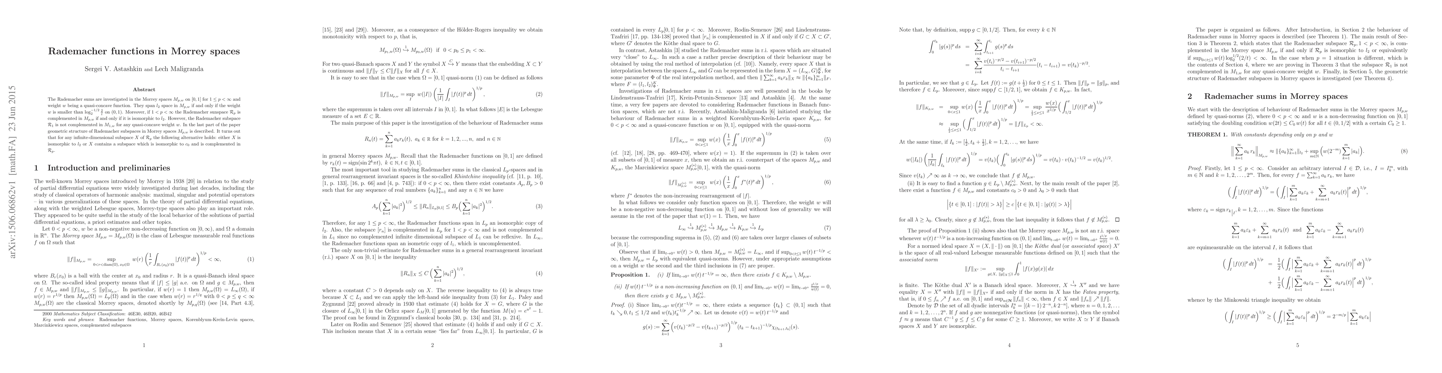 This paper explores the behavior of Rademacher functions in Morrey spaces M(p,w), showing they span l_2 space if the weight w is less than log_2^{-1/2}(2/t). It also reveals that the Rademacher subspace R_p is complemented in M(p,w) if 1 < p < ∞ and isomorphic to l_2, but not in M(1,w) for any quasi-concave weight w.