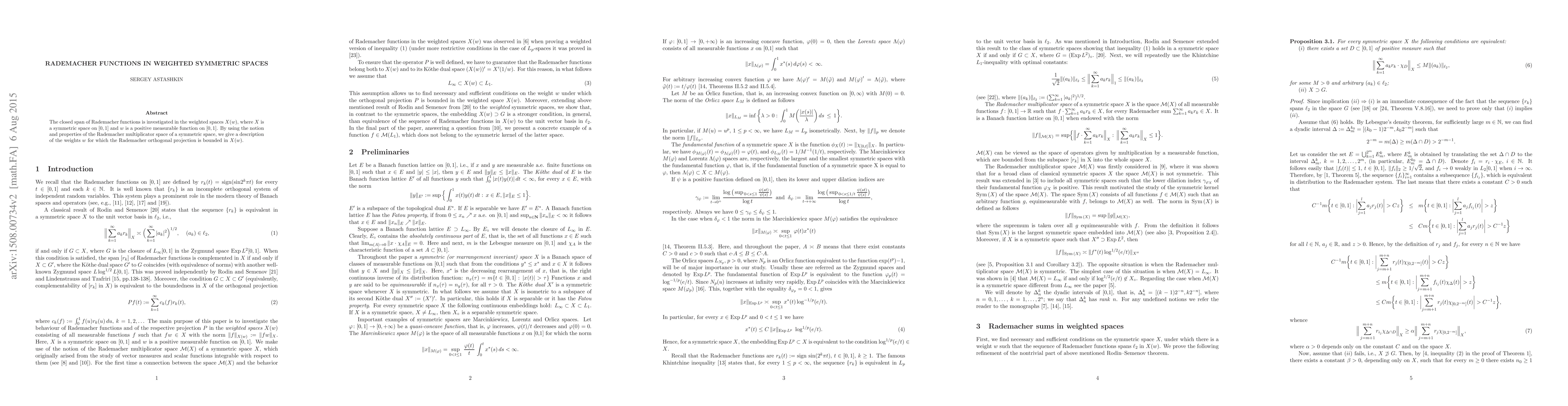 This paper examines the closed span of Rademacher functions in weighted symmetric spaces X(w), identifying conditions on the weight function w that ensure boundedness of the Rademacher orthogonal projection. The investigation leverages the concept of the Rademacher multiplicator space associated with symmetric spaces.