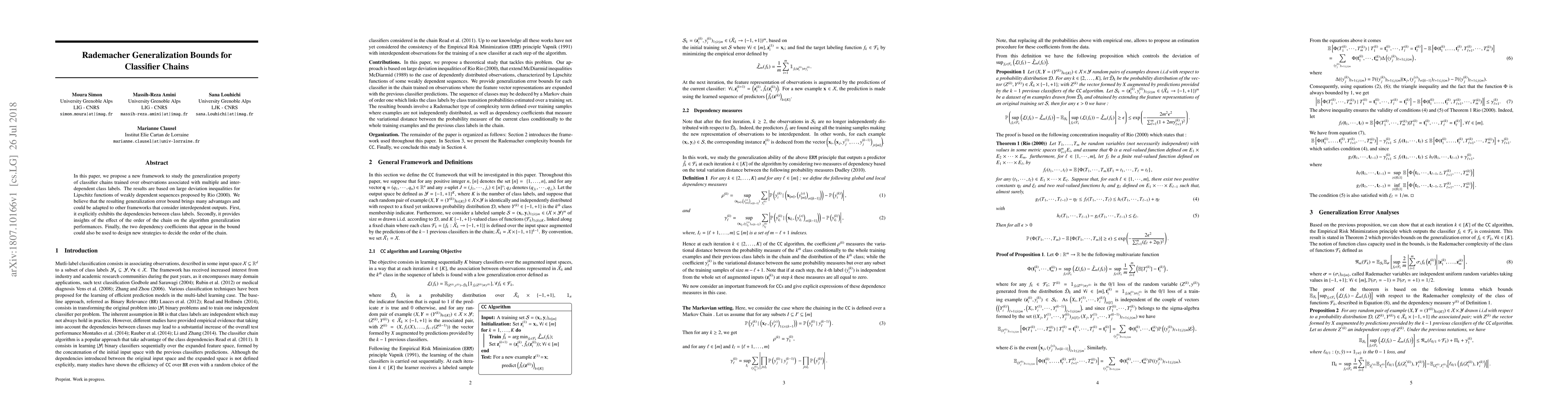 In this paper, we propose a new framework to study the generalization property of classifier chains trained over observations associated with multiple and interdependent class labels. The results are based on large deviation inequalities for Lipschitz functions of weakly dependent sequences proposed by Rio in 2000. We believe that the resulting generalization error bound brings many advantages and could be adapted to other frameworks that consider interdependent outputs. First, it explicitly exhibits the dependencies between class labels. Secondly, it provides insights of the effect of the order of the chain on the algorithm generalization performances. Finally, the two dependency coefficients that appear in the bound could also be used to design new strategies to decide the order of the chain.