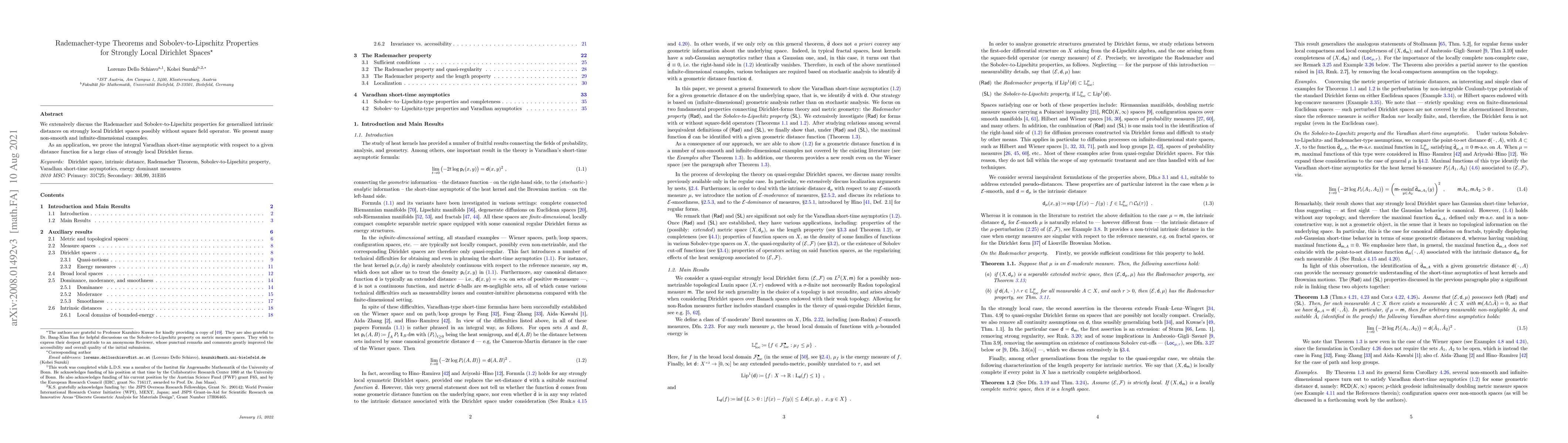 This paper explores Rademacher and Sobolev-to-Lipschitz properties in strongly local Dirichlet spaces, presenting non-smooth, infinite-dimensional examples. It also proves the integral Varadhan short-time asymptotic for a broad class of these spaces.