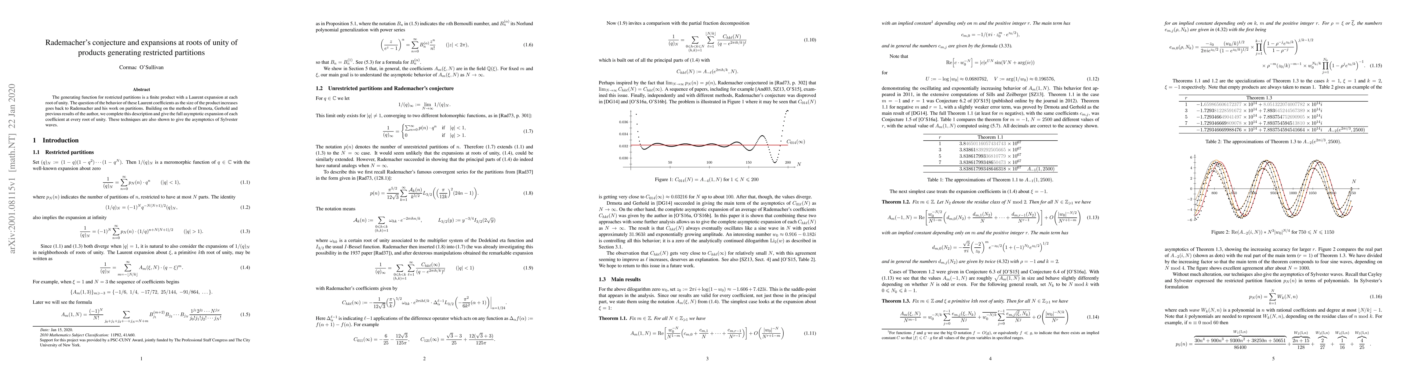 The generating function for restricted partitions is a finite product with a Laurent expansion at each root of unity. The question of the behavior of these Laurent coefficients as the size of the product increases goes back to Rademacher and his work on partitions. Building on the methods of Drmota, Gerhold and previous results of the author, we complete this description and give the full asymptotic expansion of each coefficient at every root of unity. These techniques are also shown to give the asymptotics of Sylvester waves.