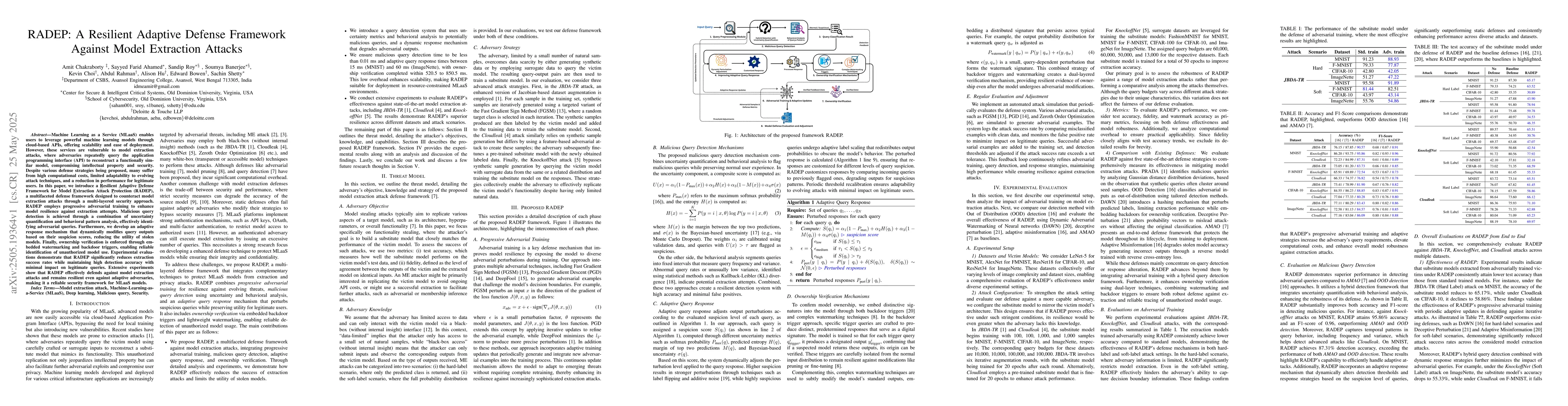 The main technical contribution is RADEP, a resilient adaptive defense framework that combines adversarial training, query analysis, adaptive response, and watermarking for model extraction attack protection.