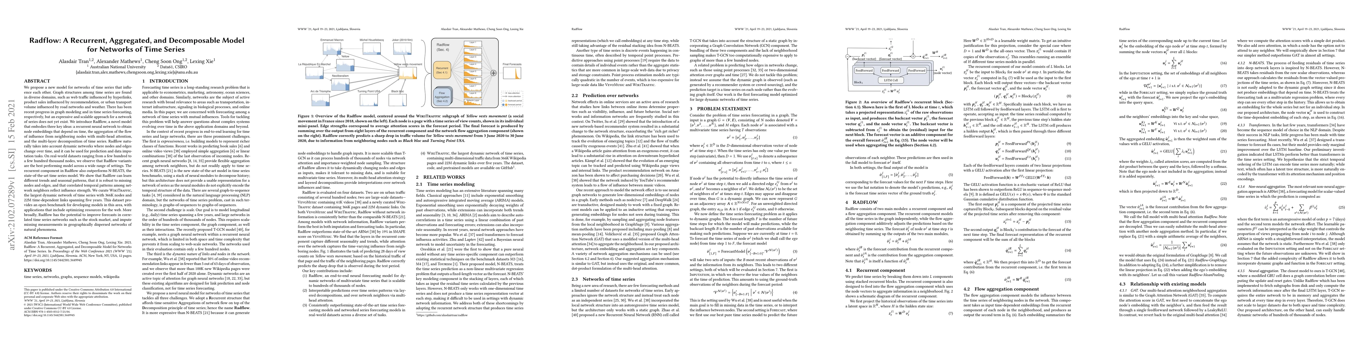 We propose a new model for networks of time series that influence each other. Graph structures among time series are found in diverse domains, such as web traffic influenced by hyperlinks, product sales influenced by recommendation, or urban transport volume influenced by road networks and weather. There has been recent progress in graph modeling and in time series forecasting, respectively, but an expressive and scalable approach for a network of series does not yet exist. We introduce Radflow, a novel model that embodies three key ideas: a recurrent neural network to obtain node embeddings that depend on time, the aggregation of the flow of influence from neighboring nodes with multi-head attention, and the multi-layer decomposition of time series. Radflow naturally takes into account dynamic networks where nodes and edges change over time, and it can be used for prediction and data imputation tasks. On real-world datasets ranging from a few hundred to a few hundred thousand nodes, we observe that Radflow variants are the best performing model across a wide range of settings. The recurrent component in Radflow also outperforms N-BEATS, the state-of-the-art time series model. We show that Radflow can learn different trends and seasonal patterns, that it is robust to missing nodes and edges, and that correlated temporal patterns among network neighbors reflect influence strength. We curate WikiTraffic, the largest dynamic network of time series with 366K nodes and 22M time-dependent links spanning five years. This dataset provides an open benchmark for developing models in this area, with applications that include optimizing resources for the web. More broadly, Radflow has the potential to improve forecasts in correlated time series networks such as the stock market, and impute missing measurements in geographically dispersed networks of natural phenomena.