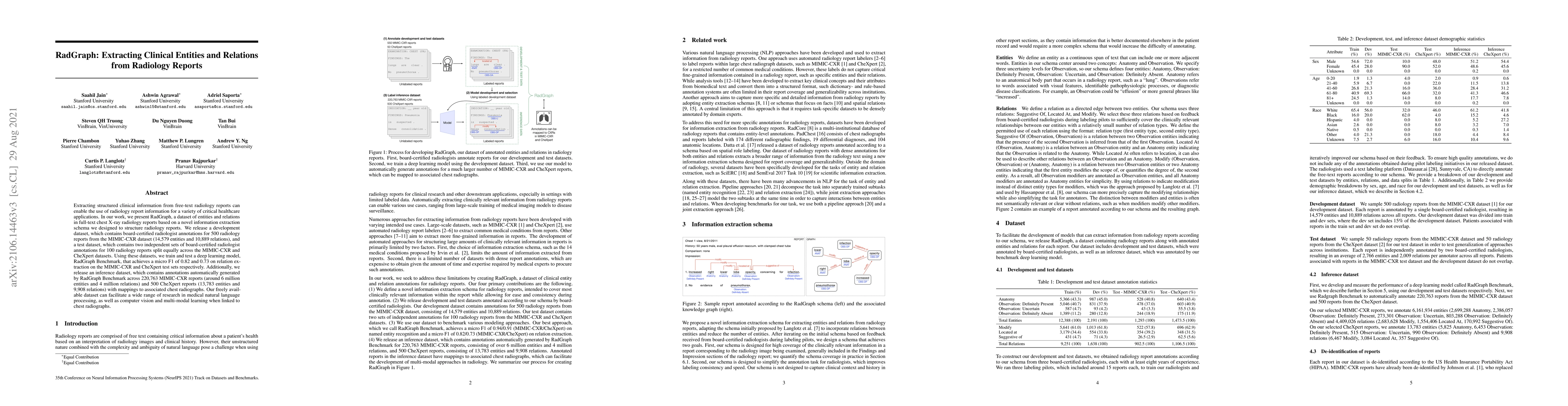 RadGraph presents a dataset for extracting clinical entities and relations from radiology reports, achieving high F1 scores on relation extraction. It includes a development and test dataset with radiologist annotations and an inference dataset for broader research in medical NLP and multi-modal learning.